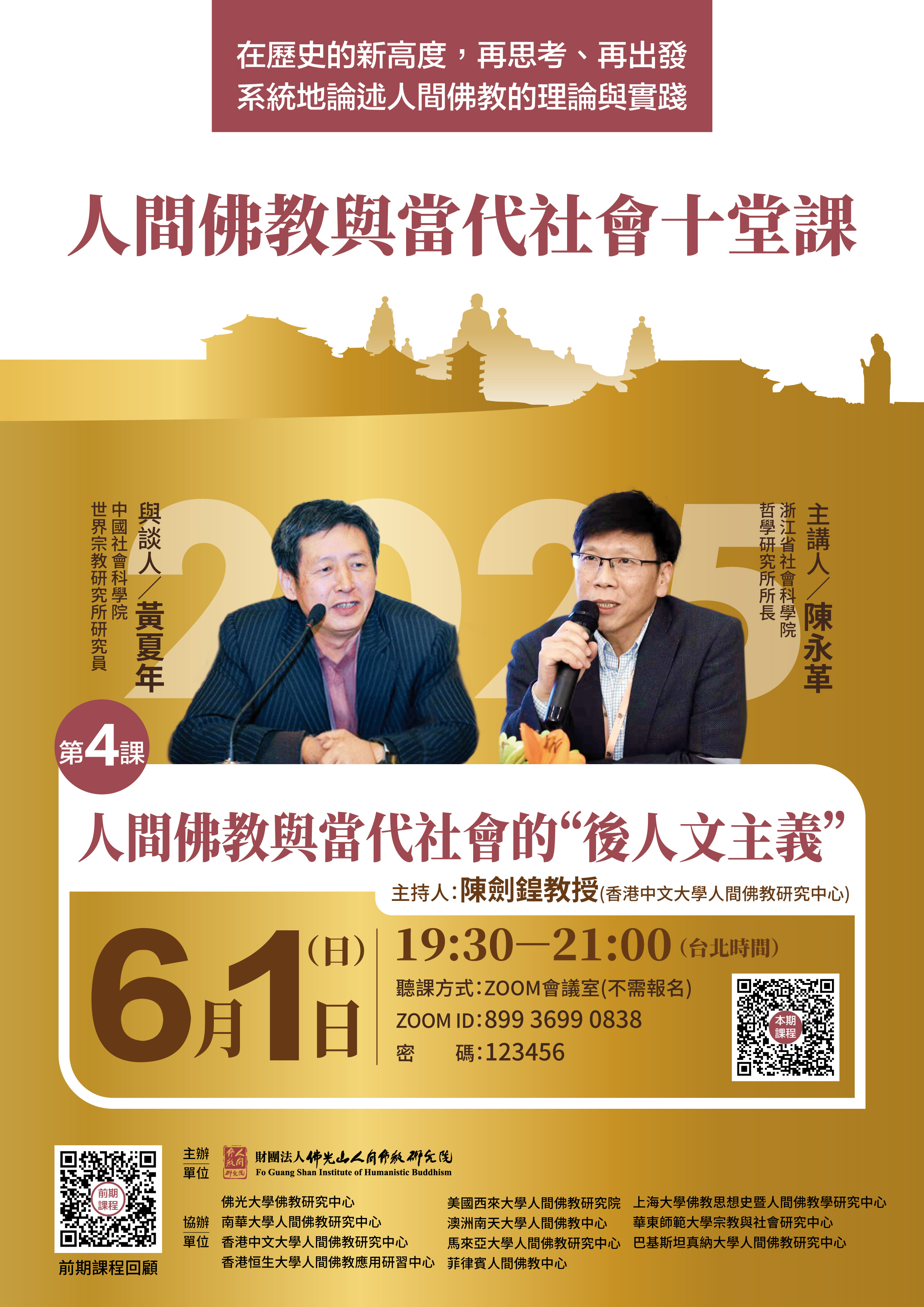 「人間佛教與當代社會十堂課」第四堂課,將於6/1晚間七點半舉行,主題為「人間佛教與當代社會的『後人文主義』」,邀請學者專家共同探討人間佛教如何在後人文時代提出精神方向,回應當代挑戰。