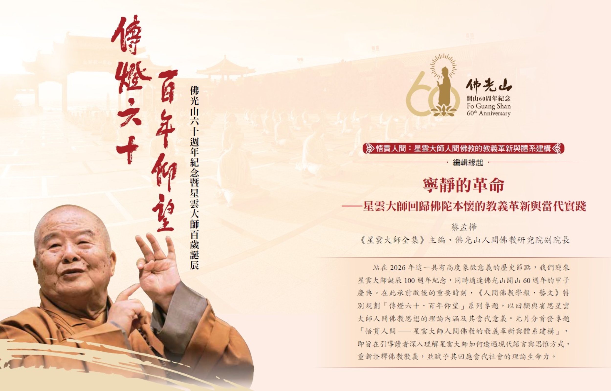 本期首發專題〈傳燈六十.百年仰望-悟貫人間:星雲大師人間佛教的教義革新與體系建構〉,聚焦大師思想核心,深入探討其教義革新與實踐成果,勾勒人間佛教發展的重要脈絡。