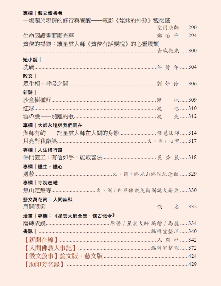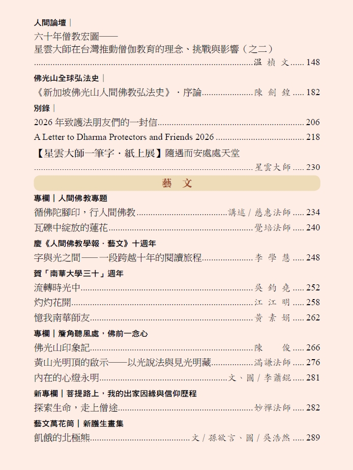 藝文版透過慈惠法師〈循佛陀腳印,行人間佛教〉、覺培法師〈瓦礫中綻放的蓮花〉等作品,呈現佛法在日常生活、災區服務與道場實踐中的真實樣貌。全刊25篇佳作,涵括修行道風、生命禪意與文化藝術,充分展現人間佛法的廣度與深度。