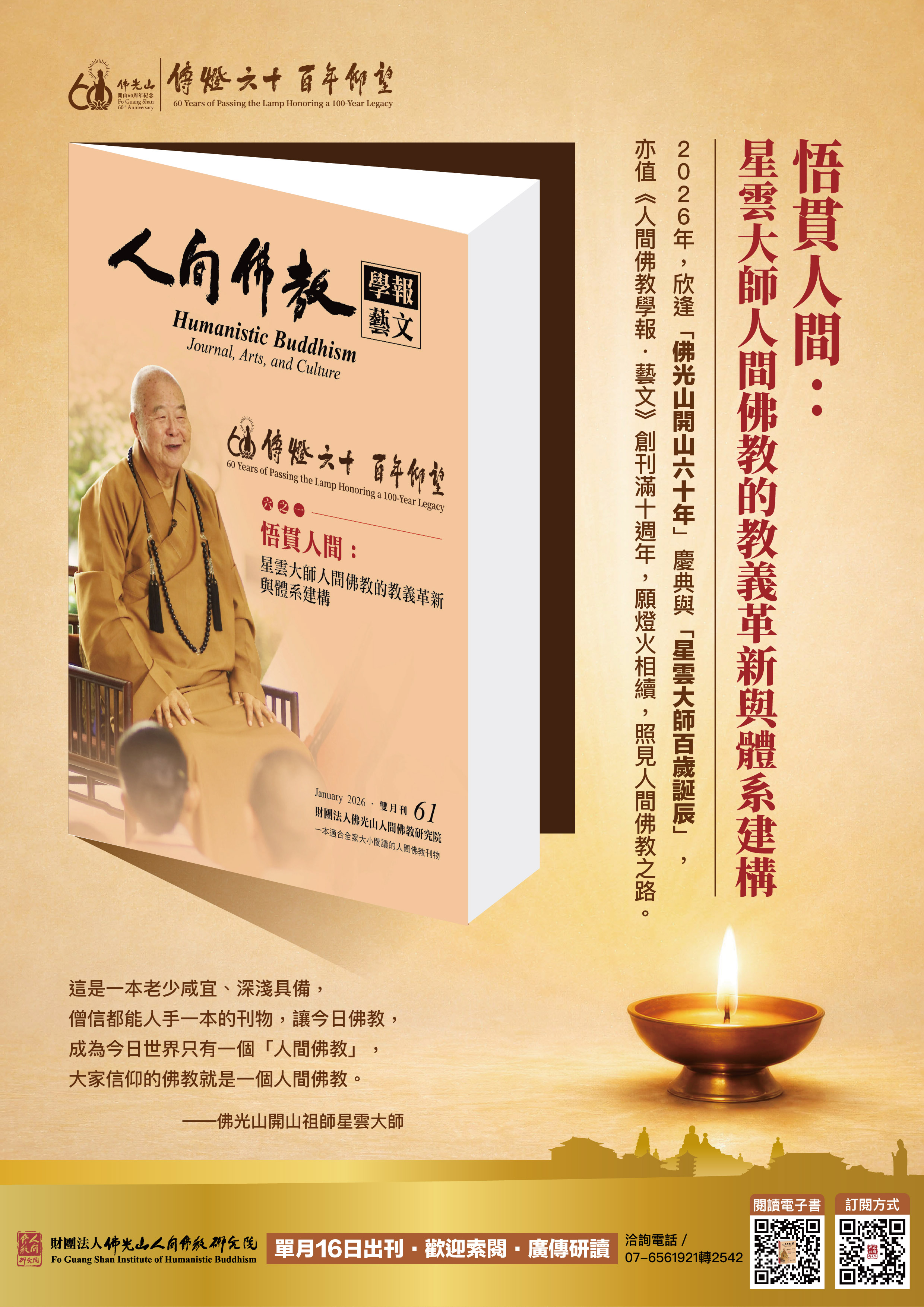 由佛光山人間佛教研究院出版的《人間佛教學報.藝文》第61期,於1月16日發行。欣逢「佛光山開山六十週年」及「星雲大師百歲誕辰」慶典,同時也迎來《學報》創刊十週。三重盛事交織,彰顯人間佛教思想傳承的深遠意義。