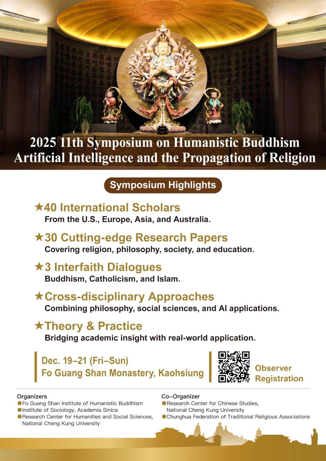 2025年第十一屆人間佛教座談會將於12月19日至21日,在高雄佛光山舉行。會議由佛光山人間佛教研究院、中央研究院社會學研究所及國立成功大學人文社會科學中心聯合主辦,並由國立成功大學漢學研究發展中心與中華傳統宗教總會協辦,以「AI時代與宗教傳播」為主題,展現學界與教界在AI(人工智能)時代下的學術研究與理論實踐成果。