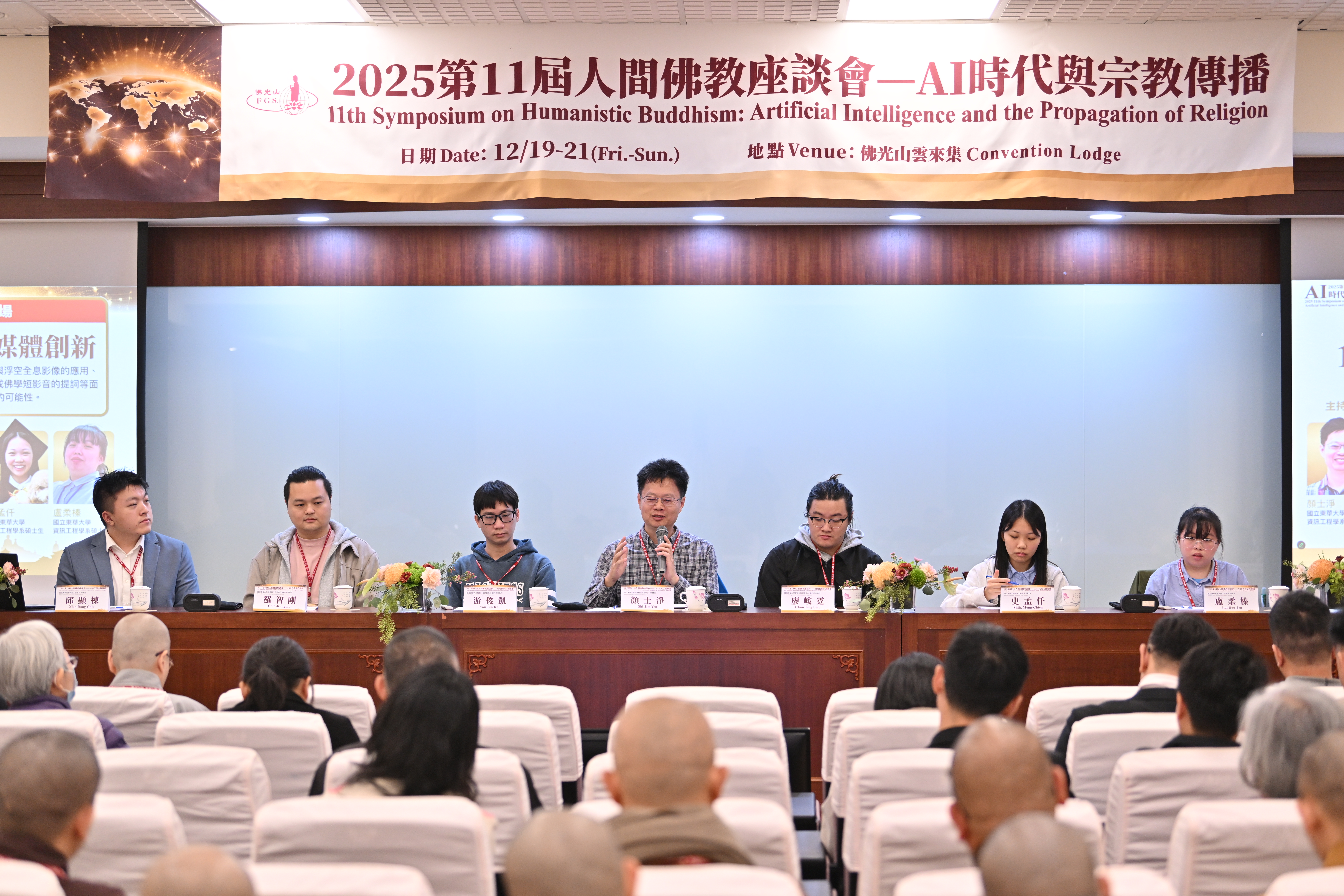 2025第11屆人間佛教座談會──AI時代與宗教傳播,12月20在佛光山雲來集展開中文第二場座談,聚焦「AI與佛教多媒體創新」,由國立東華大學資訊工程學系特聘教授顏士淨主持,發表人國立東華大學智慧科技研究中心專任研究助理羅智剛、游俊凱、廖峻霆、資訊工程學系博士生邱顯棟、碩士生史孟仟、盧柔榛,分別論述AI應用於佛教法語影像、佛學電子書、短影音提詞,展現數位時代佛教新型態的傳播多元樣貌。