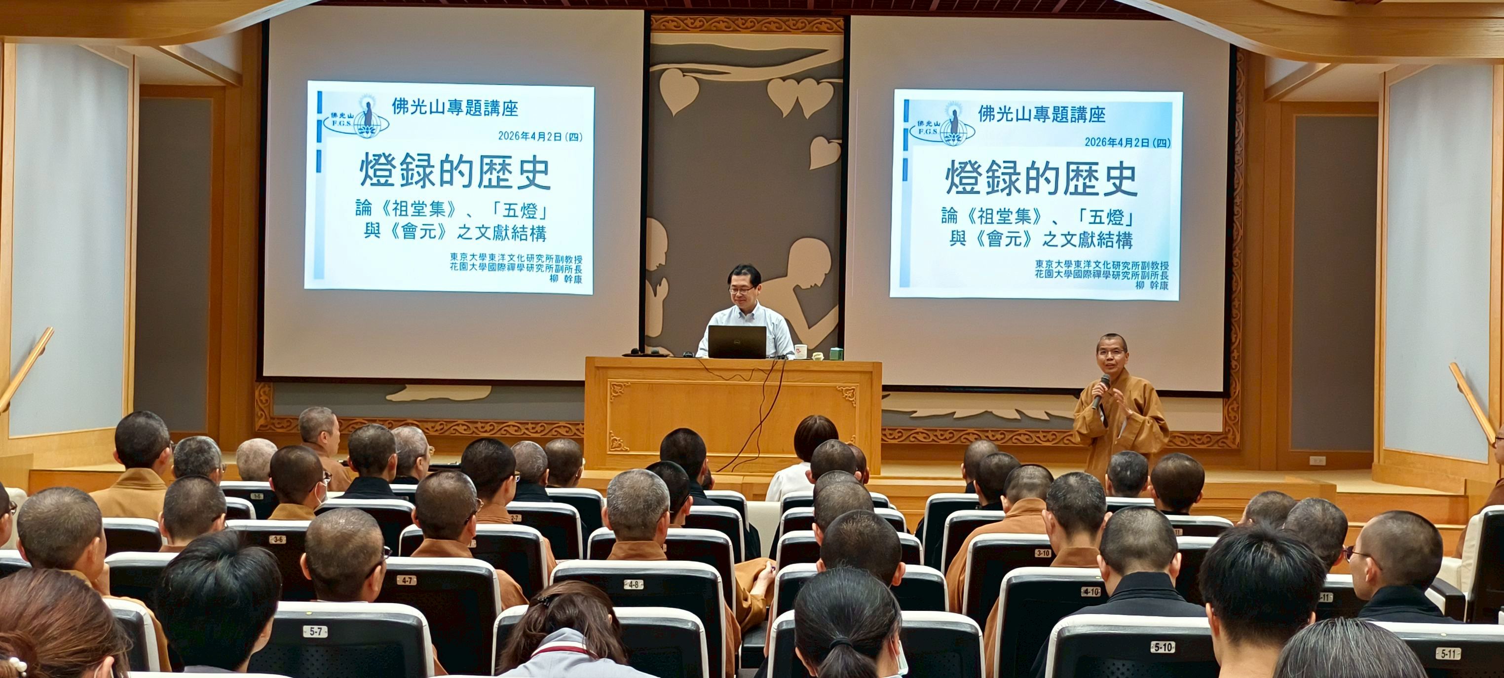 佛光山人間佛教研究院於4月2日在佛光山東禪樓舉行學術講座,禮請日本東京大學東洋文化研究所准教授柳幹康主講「燈錄的歷史:論《祖堂集》、「五燈」與《會元》之文獻結構」。以「解讀歷史觀」帶領大眾深入理解各部禪宗燈錄的傳承法脈與敘事特徵。有禪學堂、人間佛教研究院、佛陀紀念館學術發展委員會、男女眾佛學院等近80人參與聆聽。