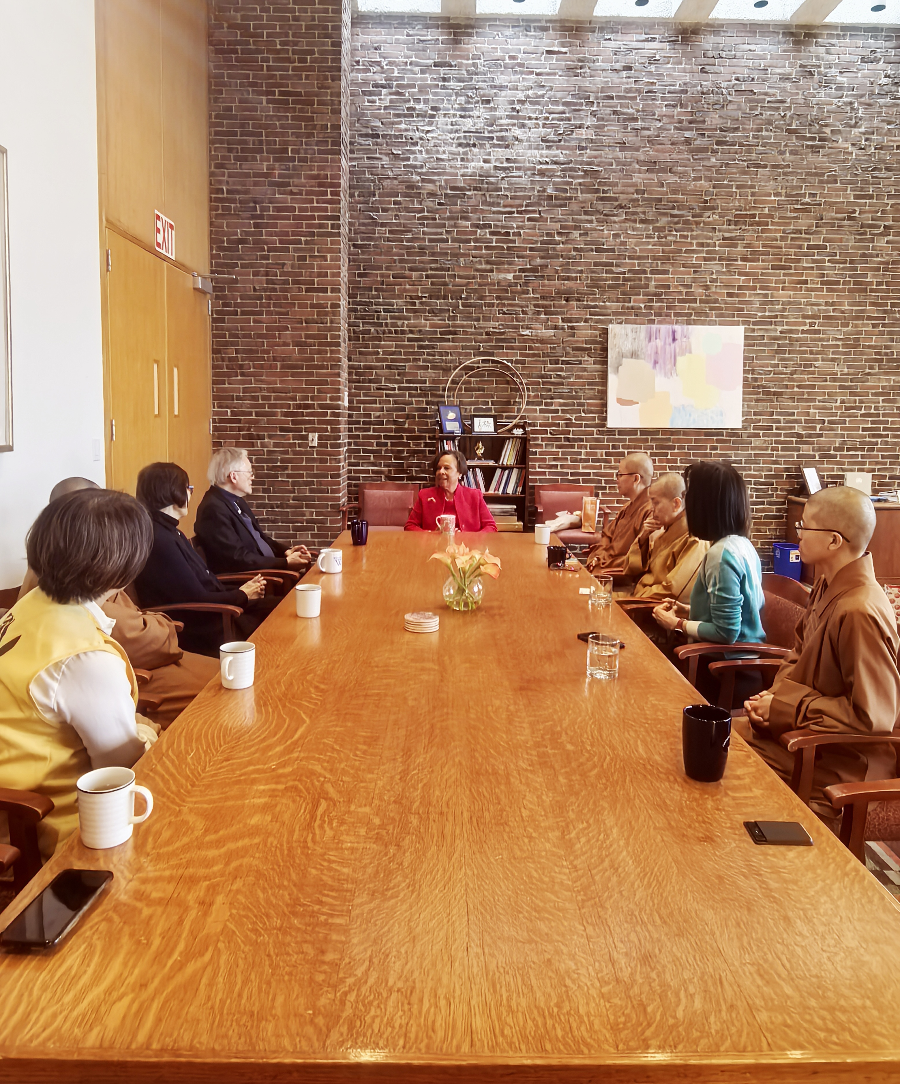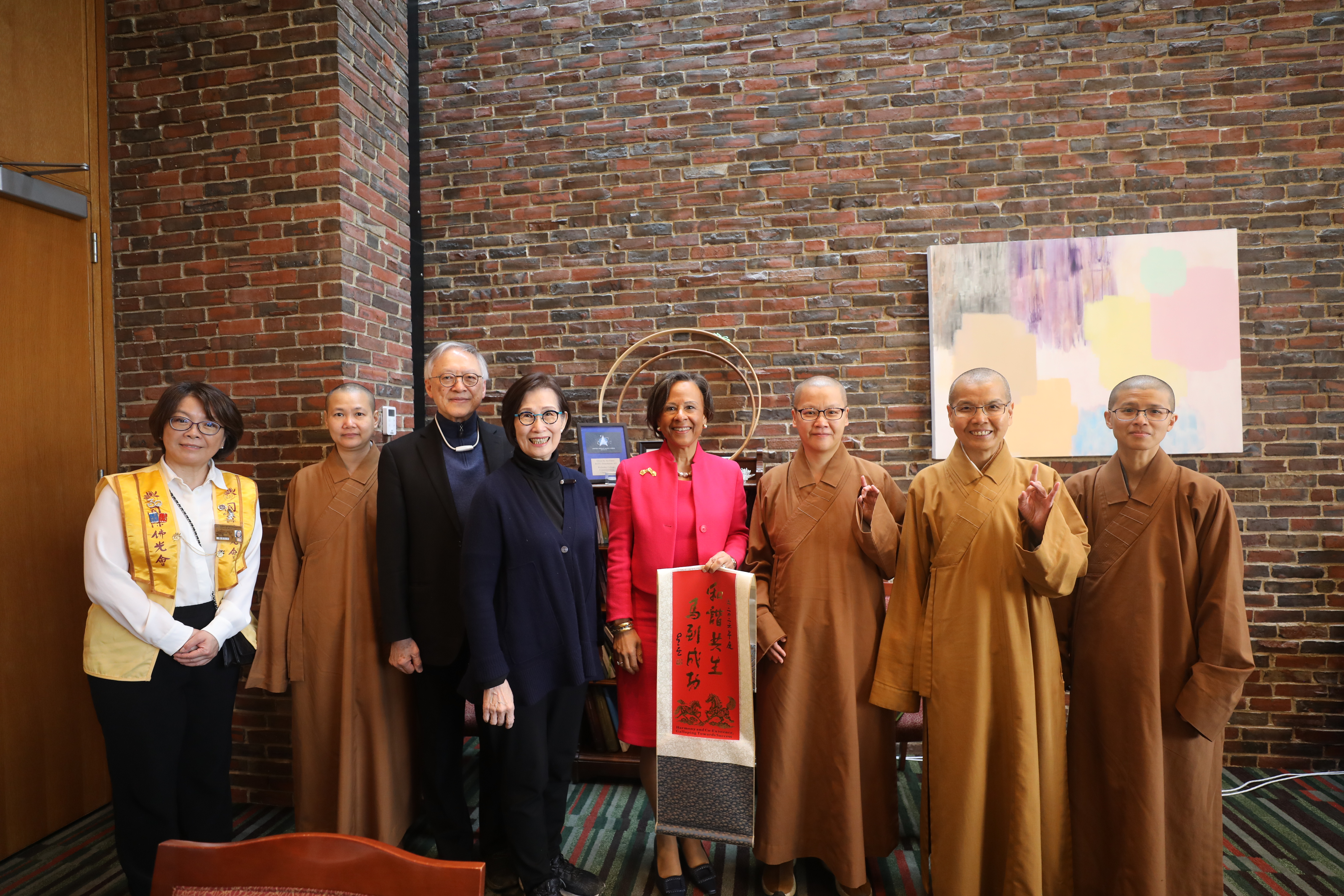 抵達校園後,一行人隨即受到校方熱情接待,與校長保拉・A・約翰遜(Dr. Paula A. Johnson)進行會面。校長非常感謝大家的到來,表示此次交流為師生帶來嶄新的宗教文化體驗,並對佛光山僧團展現濃厚興趣。會談中,趙元修居士概述佛教發展與倫理精神,妙光法師介紹人間佛教理念。校長對此次交流深表讚賞,認為此行讓其對佛教有了更為開闊而深刻的理解。