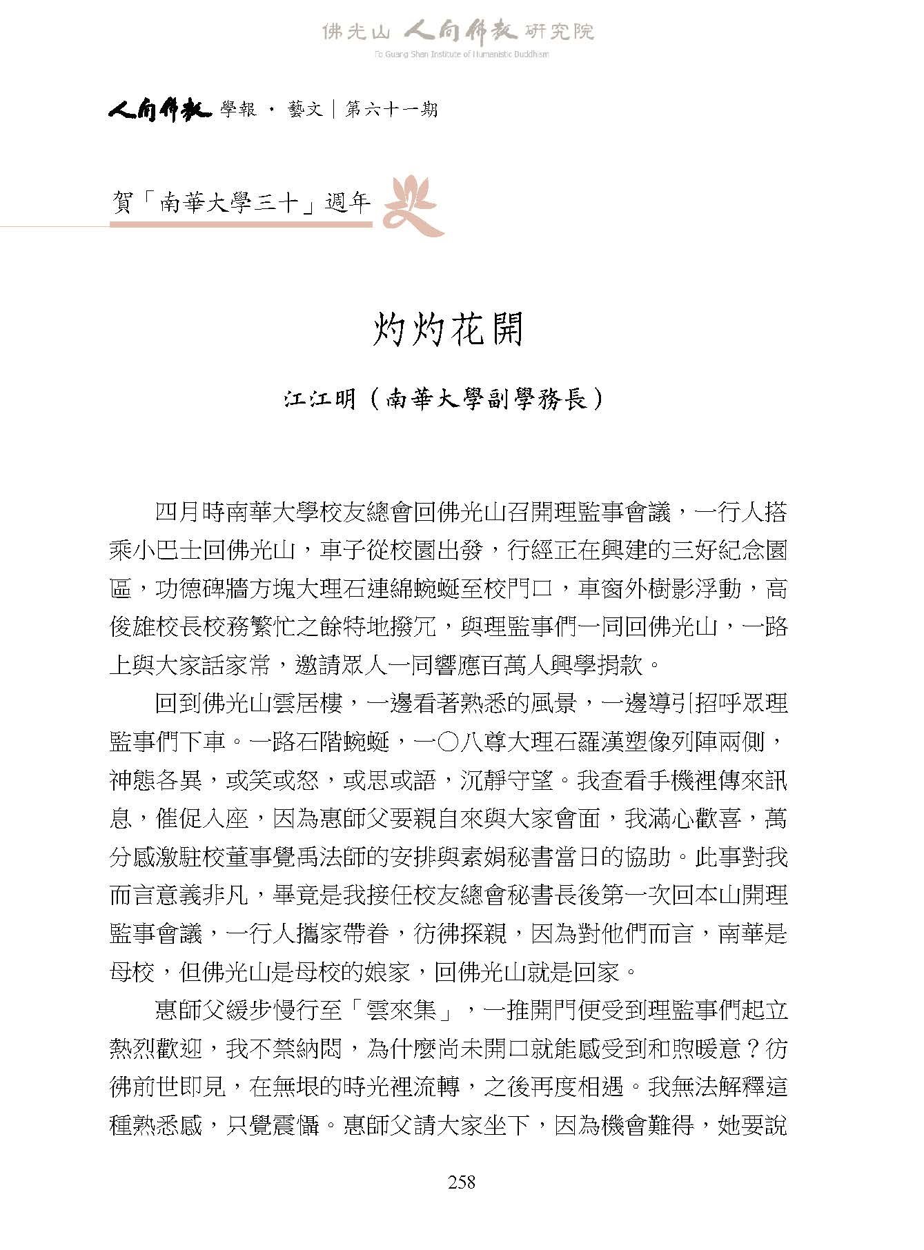 江江明:〈灼灼花開〉,收入妙凡、蔡孟樺主編:《人間佛教學報‧藝文》第61期,高雄:財團法人佛光山人間佛教研究院,2026年 01月,頁258-261。