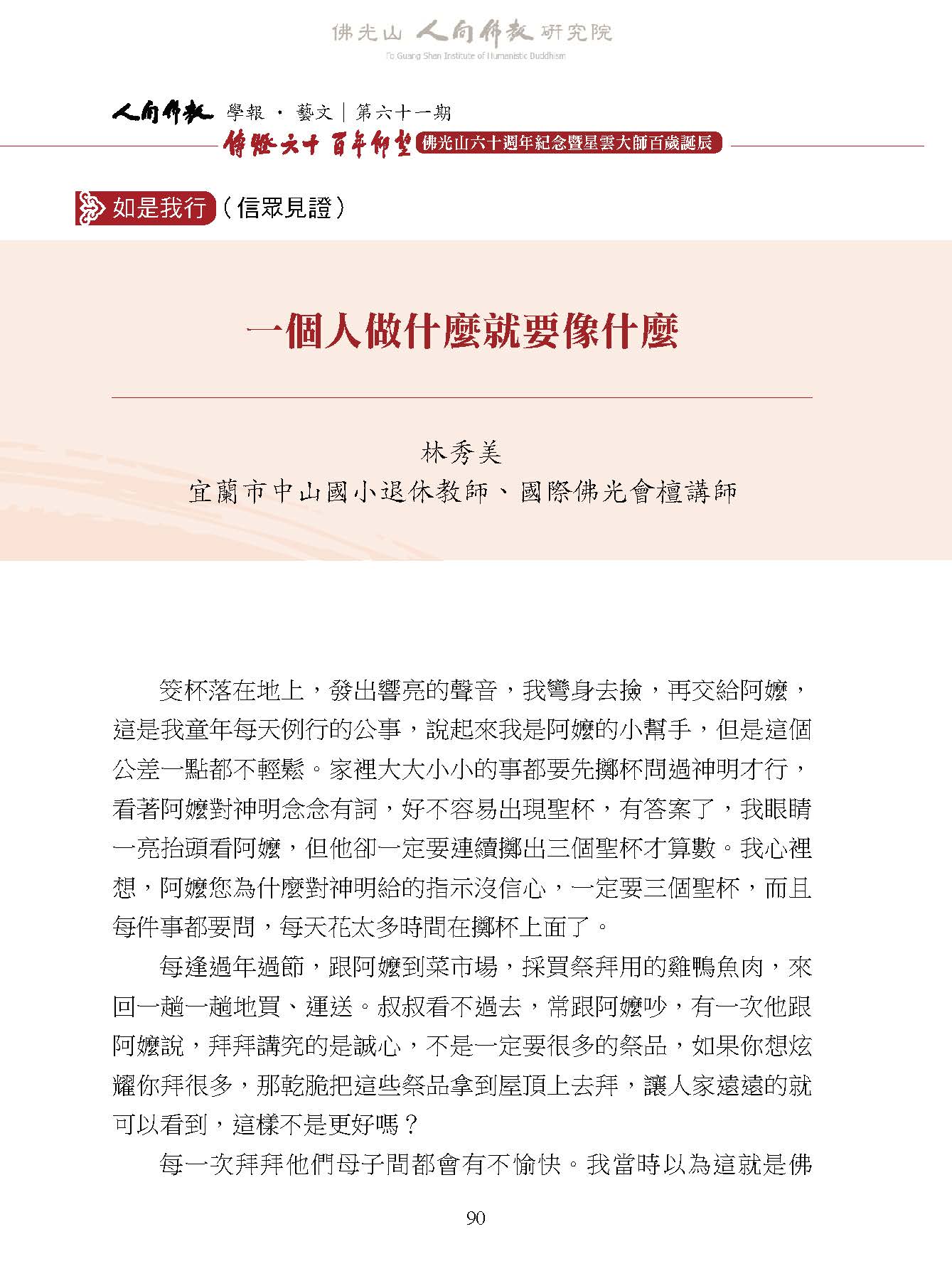 林秀美:〈一個人做什麼就要像什麼〉,收入妙凡、蔡孟樺主編:《人間佛教學報‧藝文》第61期,高雄:財團法人佛光山人間佛教研究院,,頁90-93。
