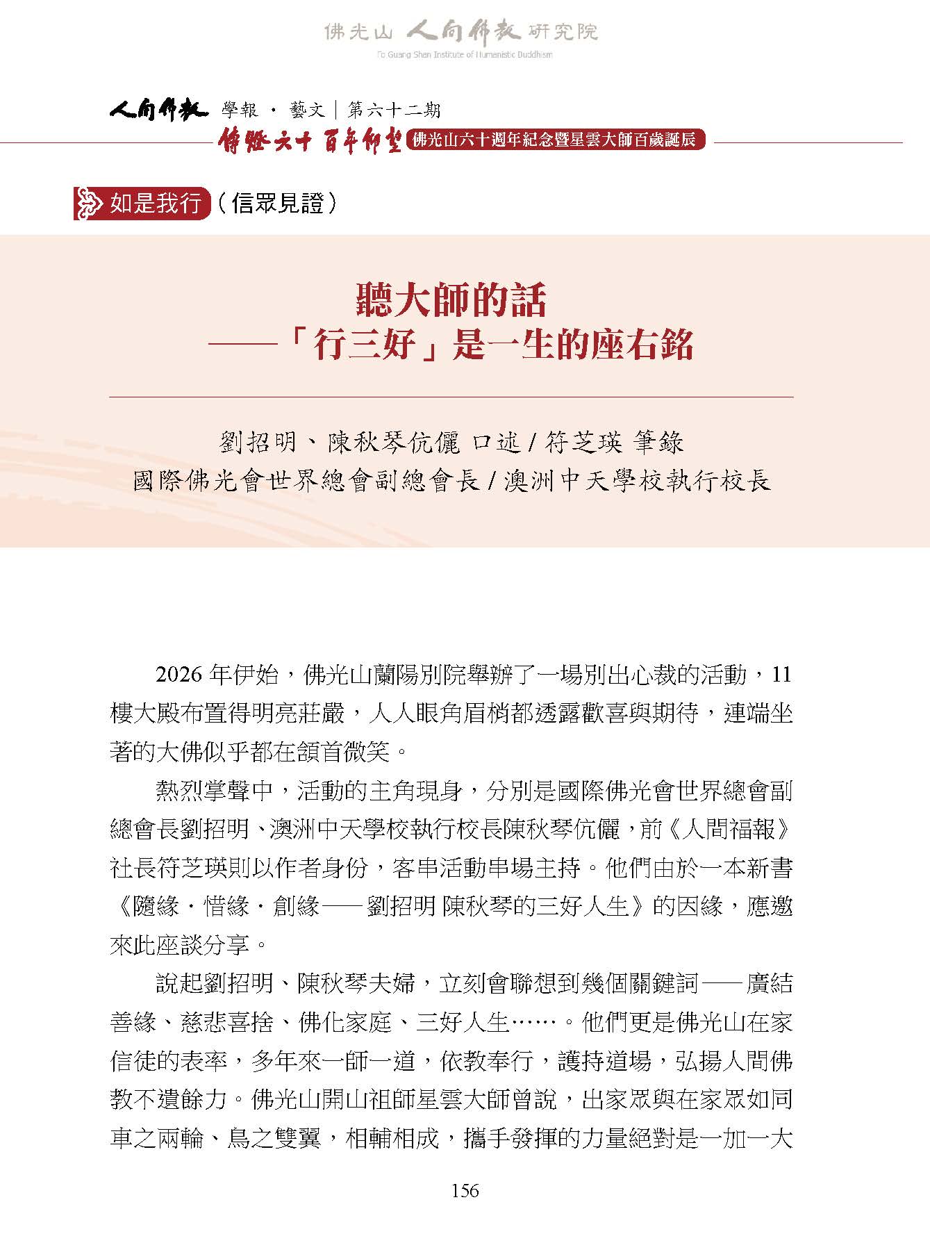 劉招明、陳秋琴伉儷 口述/ 符芝瑛 筆錄:〈聽大師的話―「行三好」是一生的座右銘〉,收入妙凡、蔡孟樺主編:《人間佛教學報‧藝文》第62期,高雄:財團法人佛光山人間佛教研究院,2026年 03月,頁156-161。