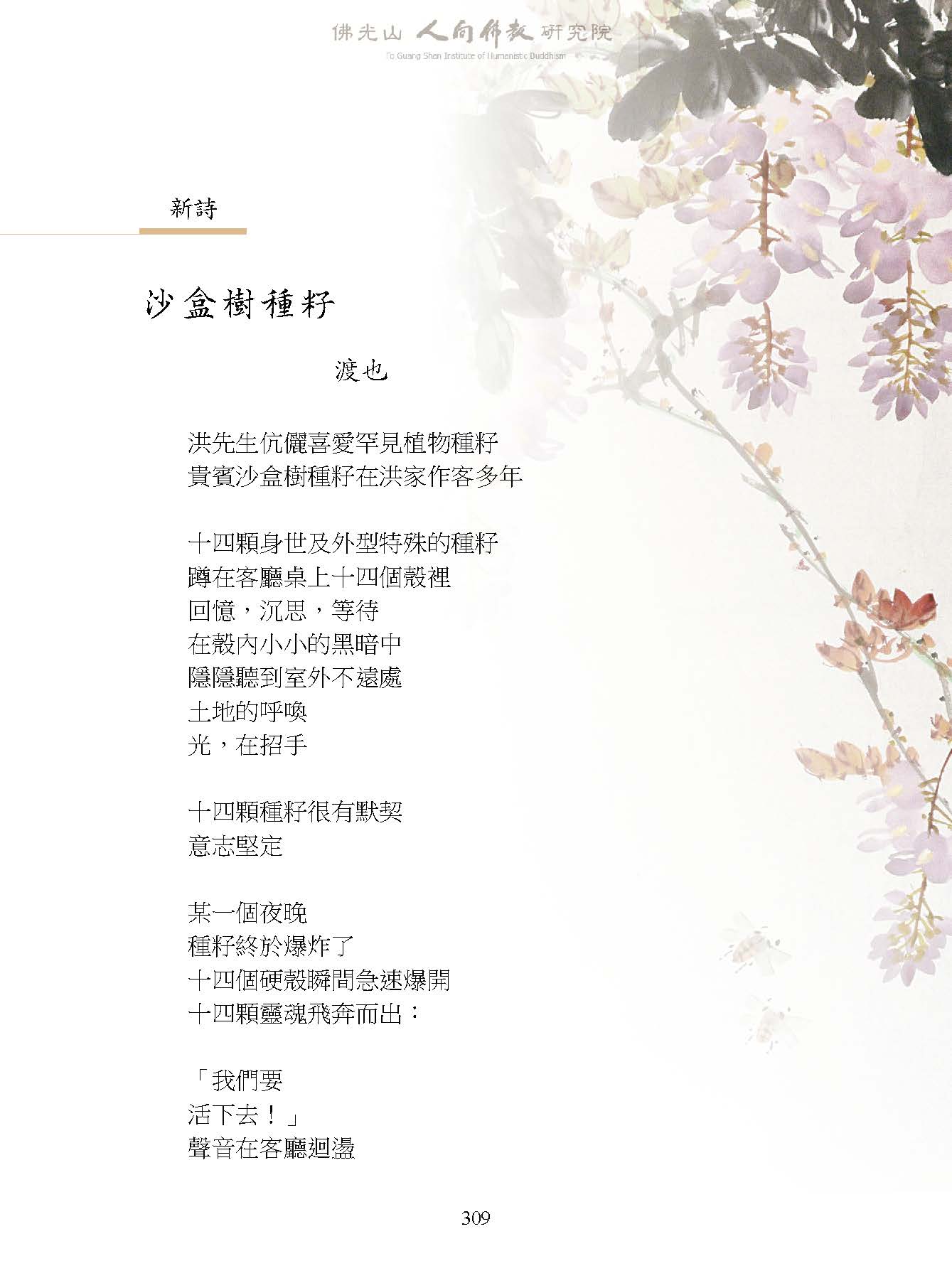 渡也:〈沙盒樹種籽〉,收入妙凡、蔡孟樺主編:《人間佛教學報‧藝文》第61期,高雄:財團法人佛光山人間佛教研究院,2026年 01月,頁309。