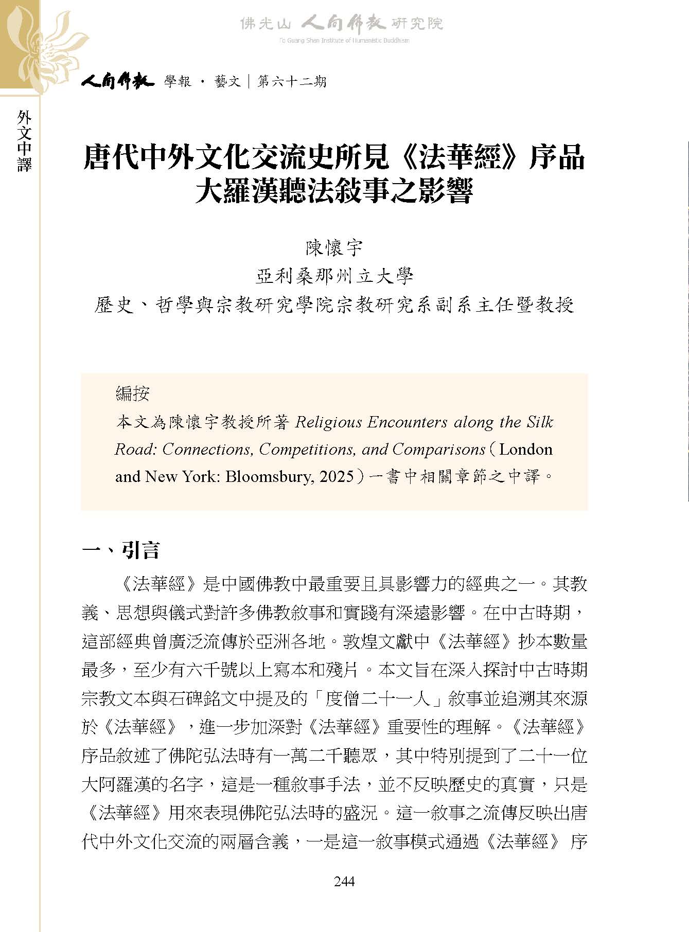 陳懷宇:〈唐代中外文化交流史所見《法華經》序品大羅漢聽法敘事之影響〉,收入妙凡、蔡孟樺主編:《人間佛教學報‧藝文》第62期,高雄:財團法人佛光山人間佛教研究院,2026年 03月,頁244-263。
