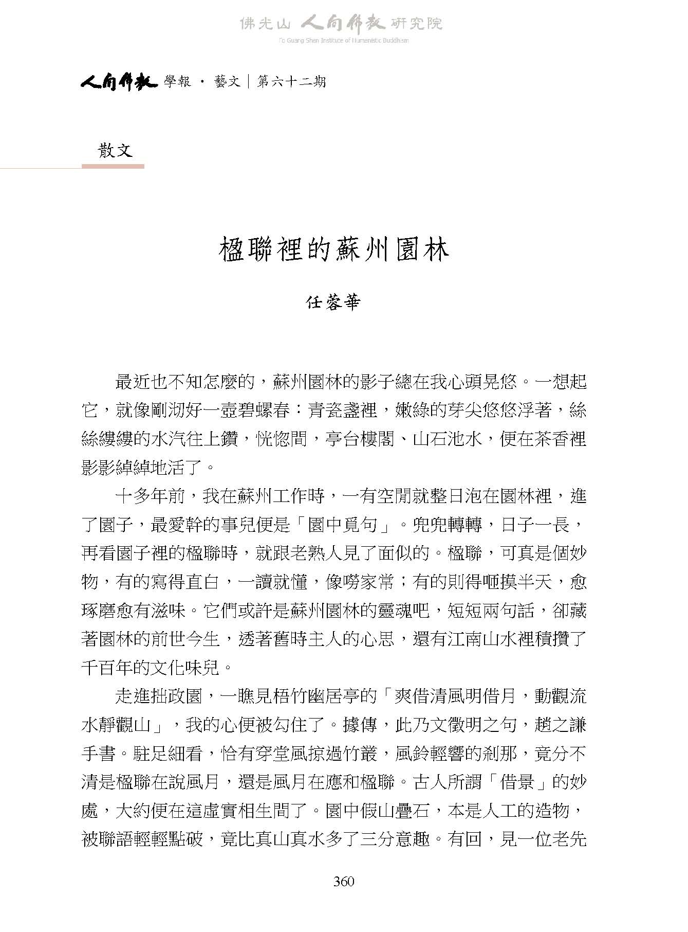 任蓉華:〈楹聯裡的蘇州園林〉,收入妙凡、蔡孟樺主編:《人間佛教學報‧藝文》第62期,高雄:財團法人佛光山人間佛教研究院,2026年 03月,頁360-362。