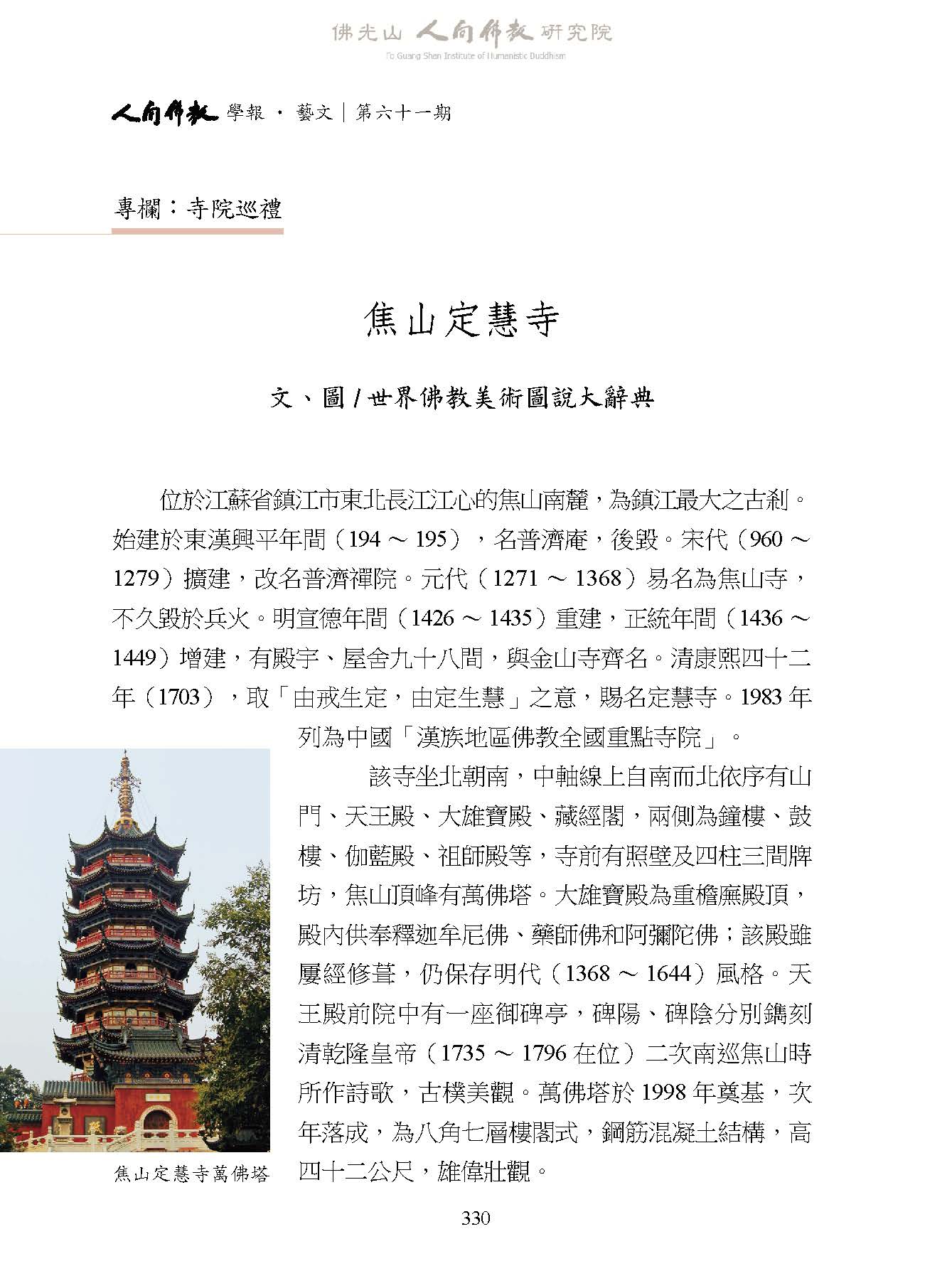 文、圖/世界佛教美術圖說大辭典:〈焦山定慧寺〉,收入妙凡、蔡孟樺主編:《人間佛教學報‧藝文》第61期,高雄:財團法人佛光山人間佛教研究院,2026年 01月,頁330-331。