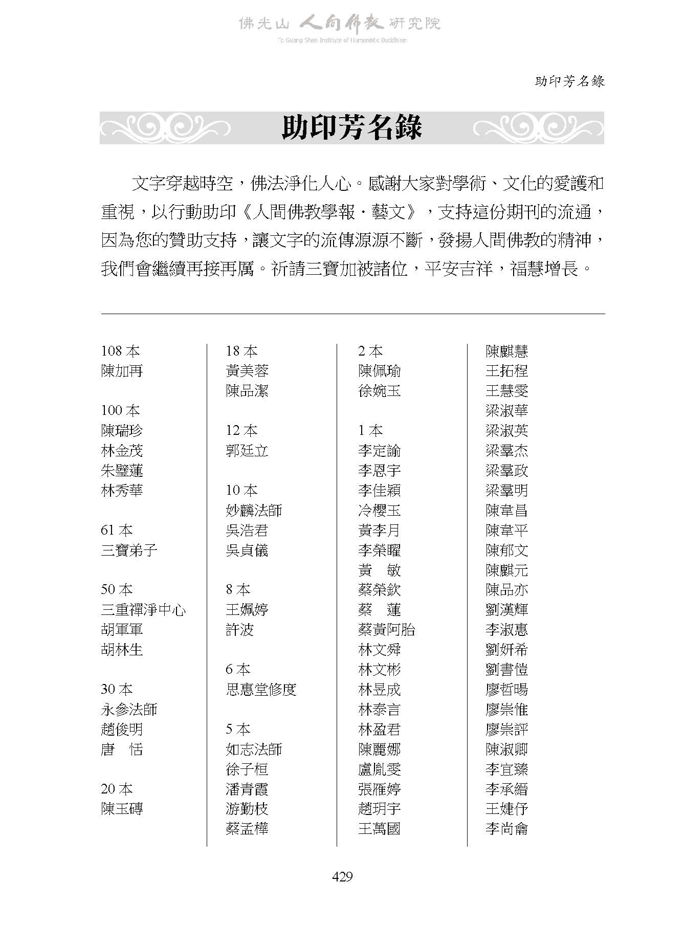:〈助印芳名錄〉,收入妙凡、蔡孟樺主編:《人間佛教學報‧藝文》第61期,高雄:財團法人佛光山人間佛教研究院,2026年 01月,頁429。