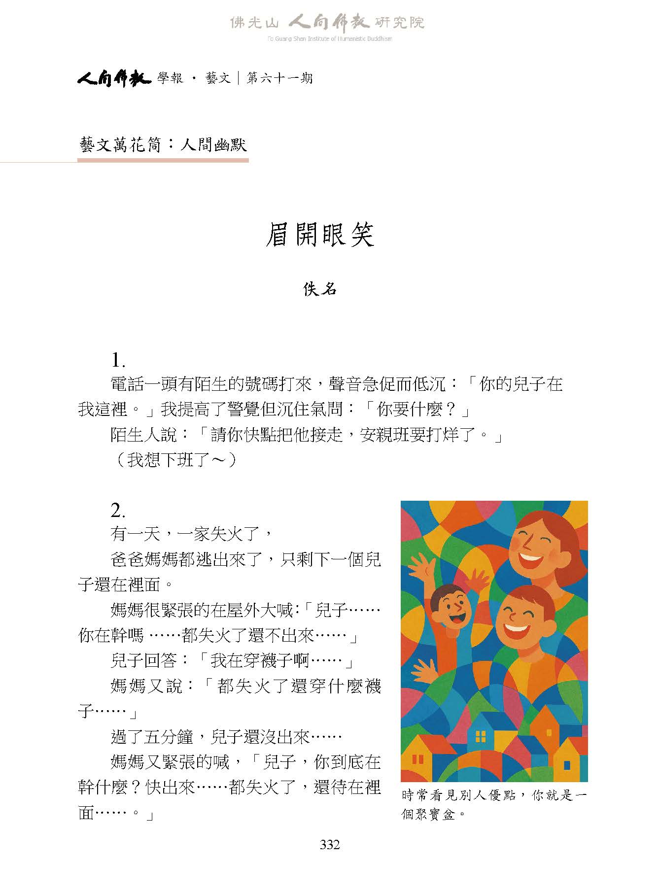 佚名:〈眉開眼笑〉,收入妙凡、蔡孟樺主編:《人間佛教學報‧藝文》第61期,高雄:財團法人佛光山人間佛教研究院,2026年 01月,頁332-333。