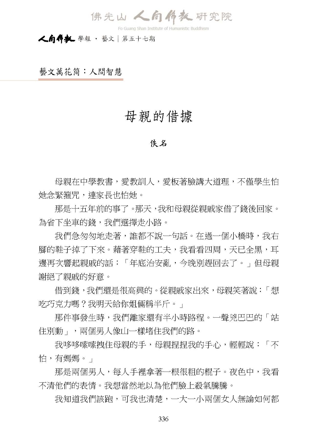 佚名:〈母親的借據〉,收入妙凡、蔡孟樺主編:《人間佛教學報‧藝文》第57期,高雄:財團法人佛光山人間佛教研究院,2025年 05月,頁336-338。