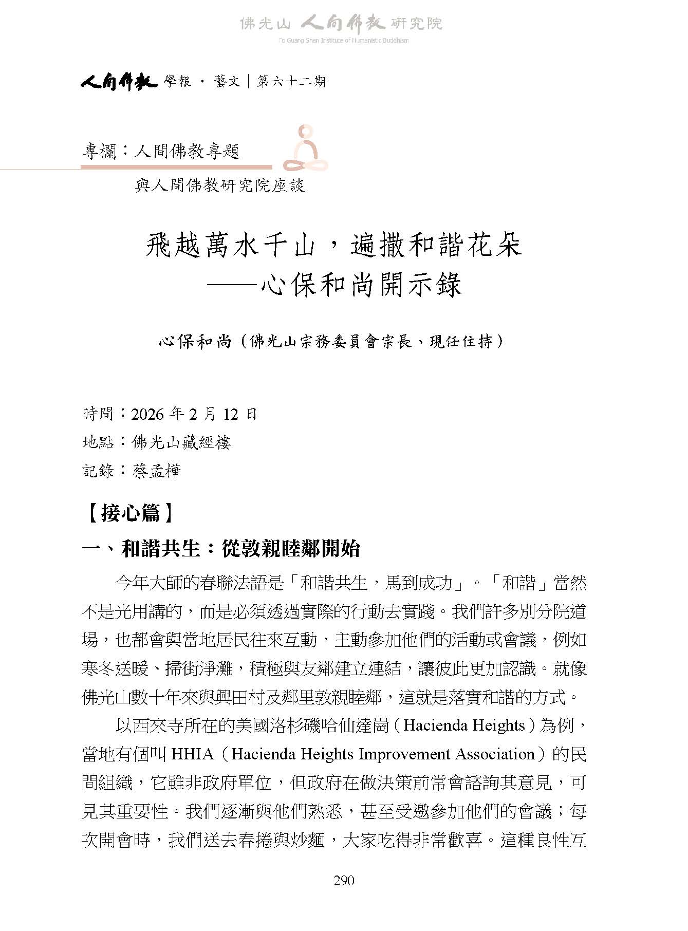 心保和尚:〈飛越萬水千山,遍撒和諧花朵—心保和尚開示錄〉,收入妙凡、蔡孟樺主編:《人間佛教學報‧藝文》第62期,高雄:財團法人佛光山人間佛教研究院,2026年 03月,頁290-309。
