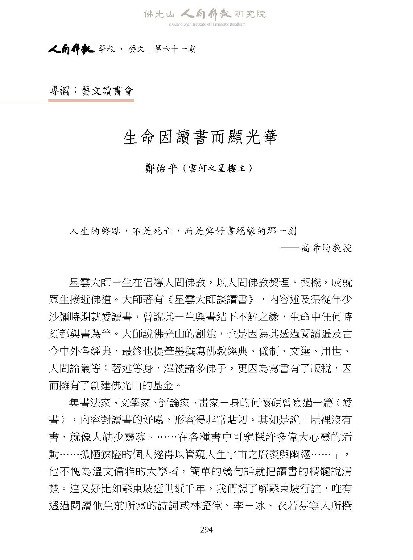 鄭治平:〈生命因讀書而顯光華〉,收入妙凡、蔡孟樺主編:《人間佛教學報‧藝文》第61期,高雄:財團法人佛光山人間佛教研究院,2026年 01月,頁294-299。