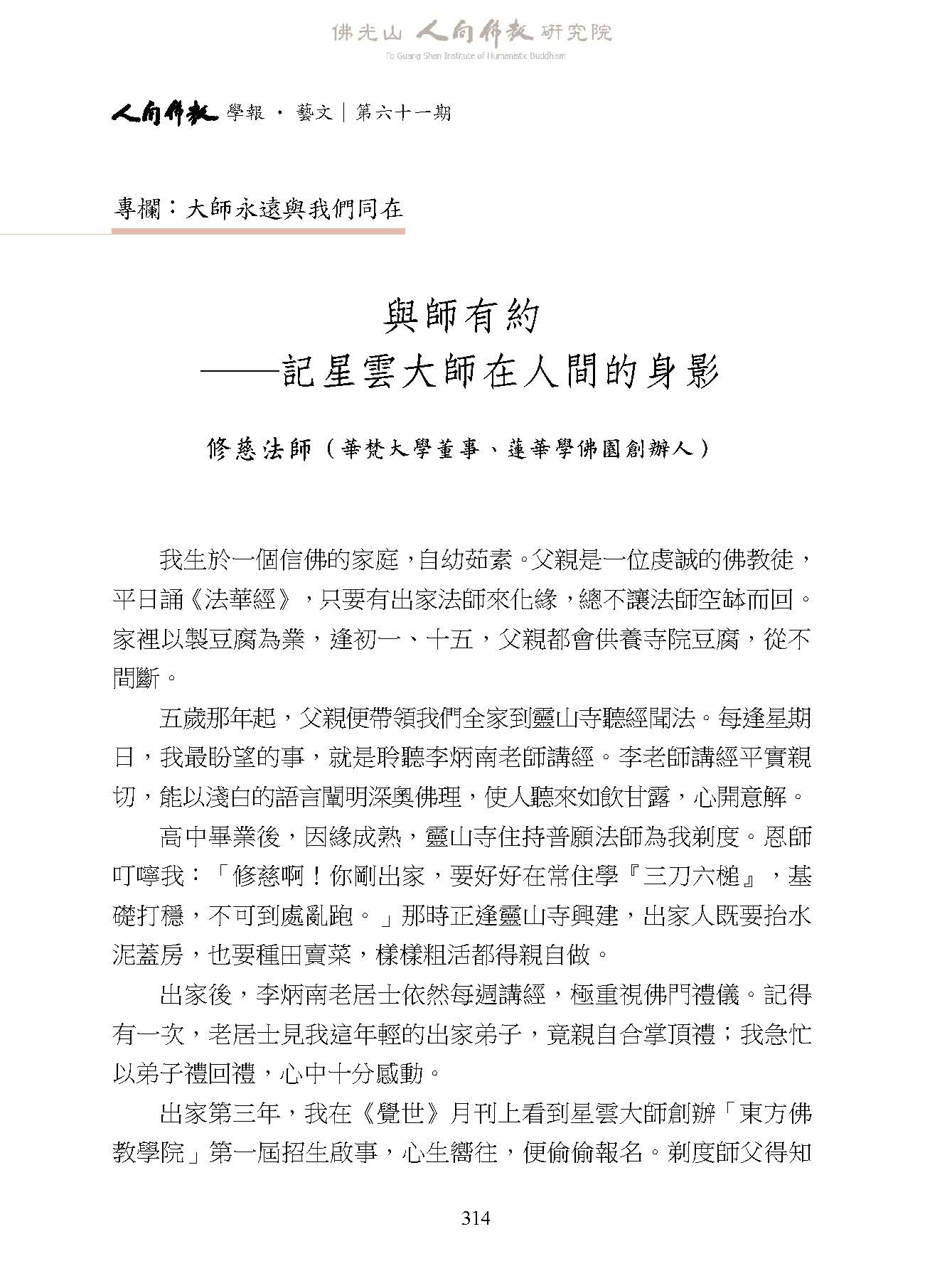 修慈法師:〈與師有約─記星雲大師在人間的身影〉,收入妙凡、蔡孟樺主編:《人間佛教學報‧藝文》第61期,高雄:財團法人佛光山人間佛教研究院,2026年 01月,頁314-316。