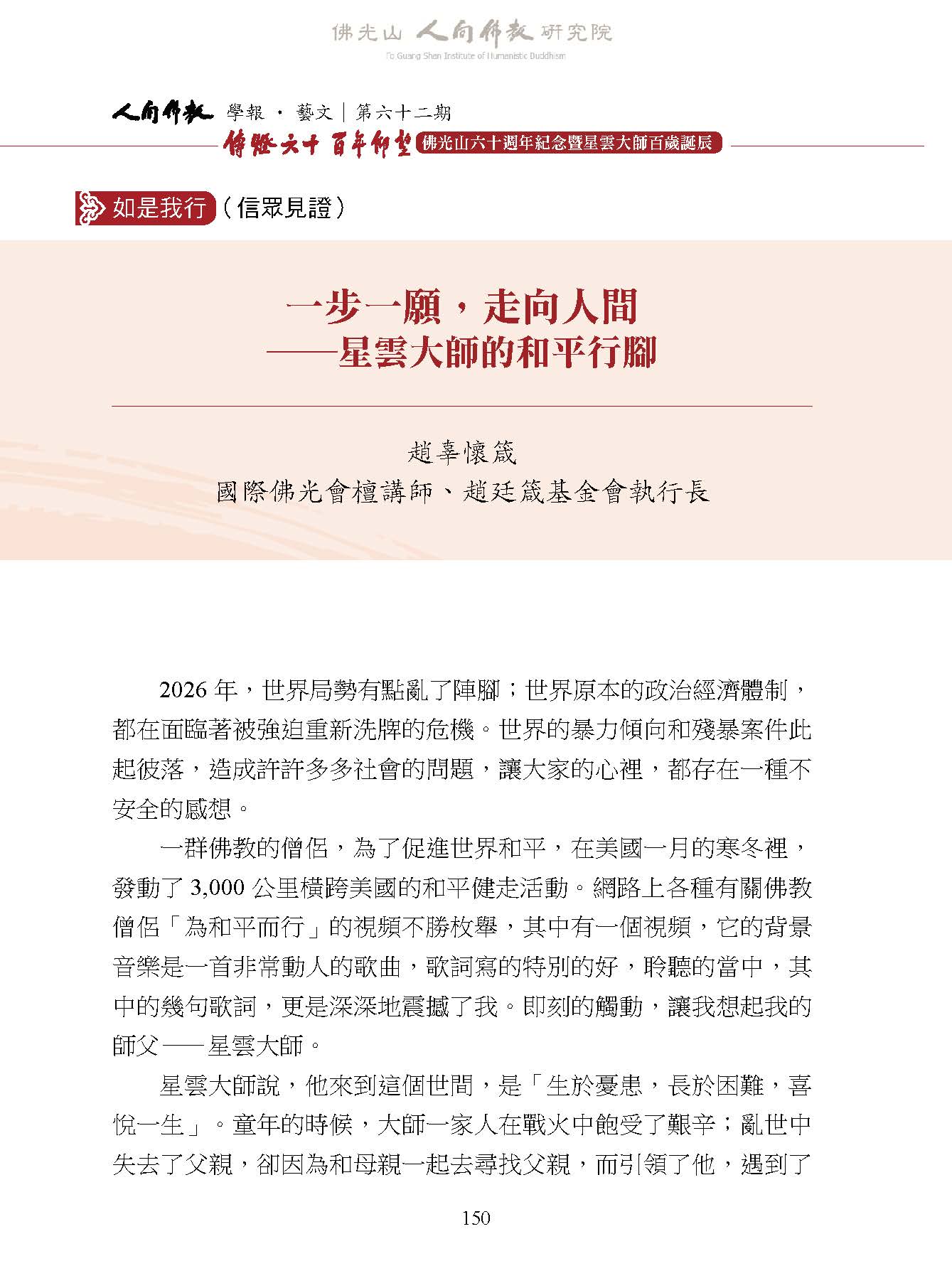 趙辜懷箴:〈一步一願,走向人間―星雲大師的和平行腳〉,收入妙凡、蔡孟樺主編:《人間佛教學報‧藝文》第62期,高雄:財團法人佛光山人間佛教研究院,2026年 03月,頁150-155。