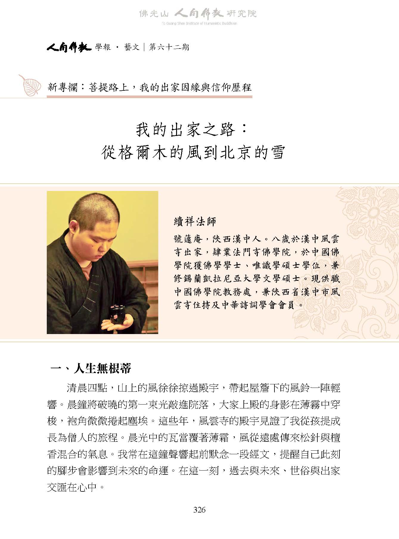 續祥法師:〈我的出家之路:從格爾木的風到北京的雪〉,收入妙凡、蔡孟樺主編:《人間佛教學報‧藝文》第62期,高雄:財團法人佛光山人間佛教研究院,2026年 03月,頁326-335。