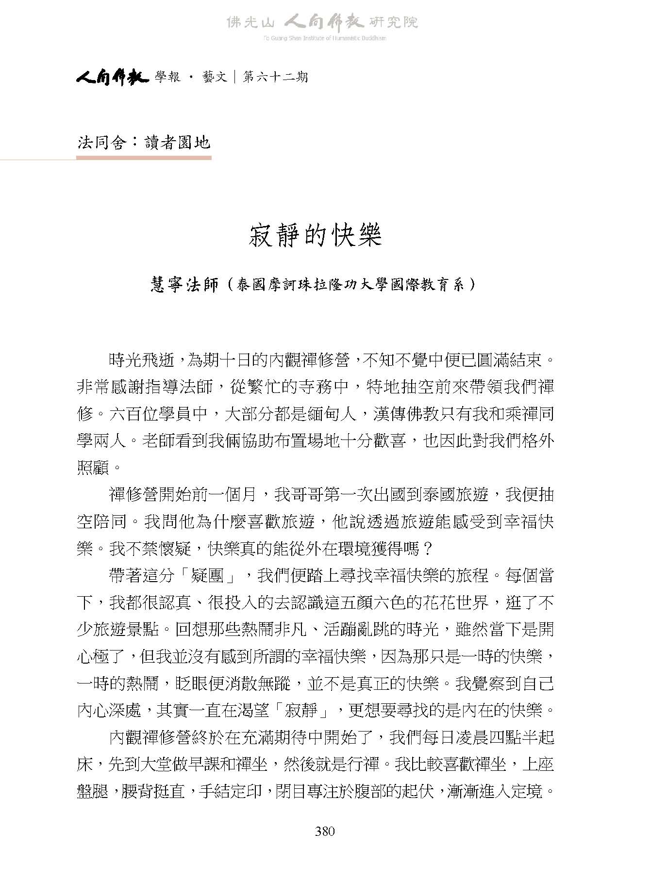 慧寧法師:〈寂靜的快樂〉,收入妙凡、蔡孟樺主編:《人間佛教學報‧藝文》第62期,高雄:財團法人佛光山人間佛教研究院,2026年 03月,頁380-381。