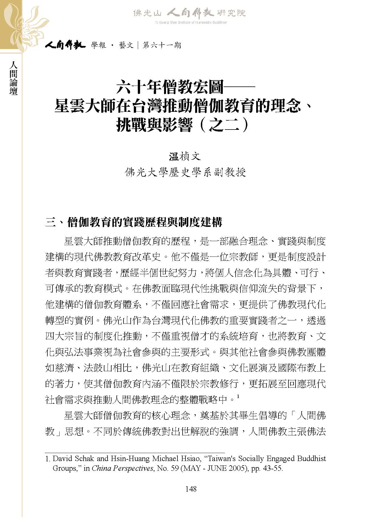 温楨文:〈六十年僧教宏圖―星雲大師在台灣推動僧伽教育的理念、挑戰與影響(之二)〉,收入妙凡、蔡孟樺主編:《人間佛教學報‧藝文》第61期,高雄:財團法人佛光山人間佛教研究院,2026年 01月,頁148-181。