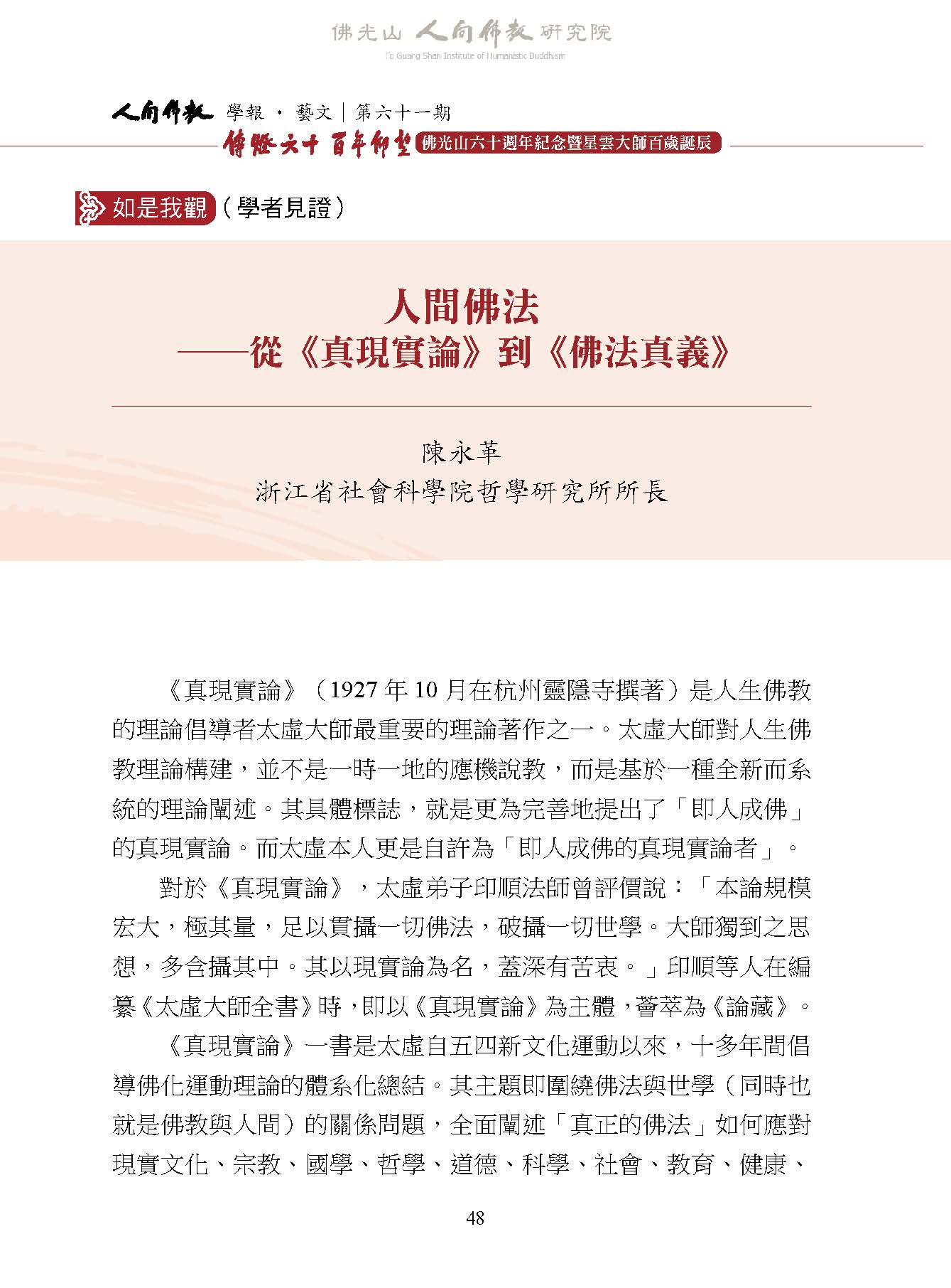 陳永革:〈人間佛法―從《真現實論》到《佛法真義》〉,收入妙凡、蔡孟樺主編:《人間佛教學報‧藝文》第61期,高雄:財團法人佛光山人間佛教研究院,2026年 01月,頁48-55。