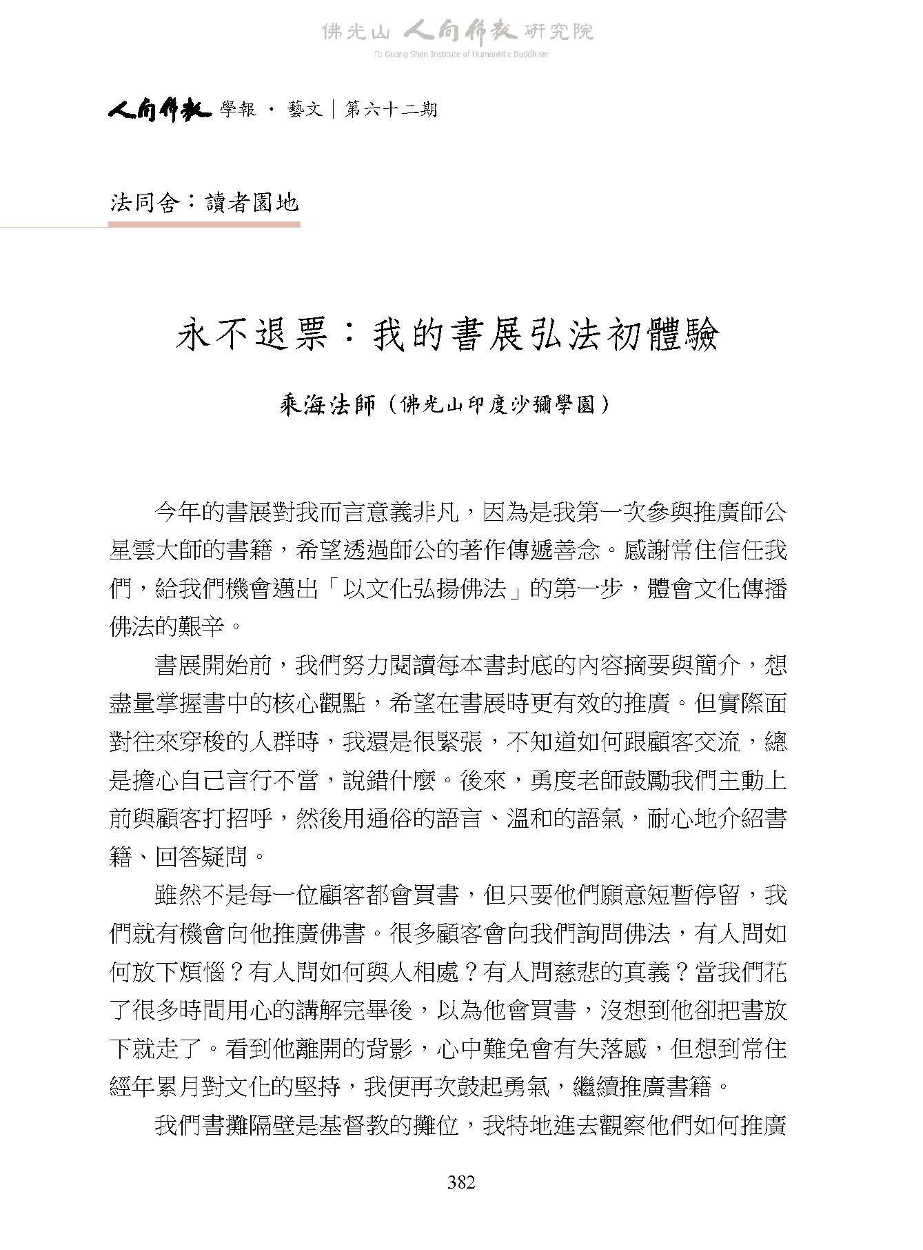 乘海法師:〈永不退票:我的書展弘法初體驗〉,收入妙凡、蔡孟樺主編:《人間佛教學報‧藝文》第62期,高雄:財團法人佛光山人間佛教研究院,2026年 03月,頁382-383。