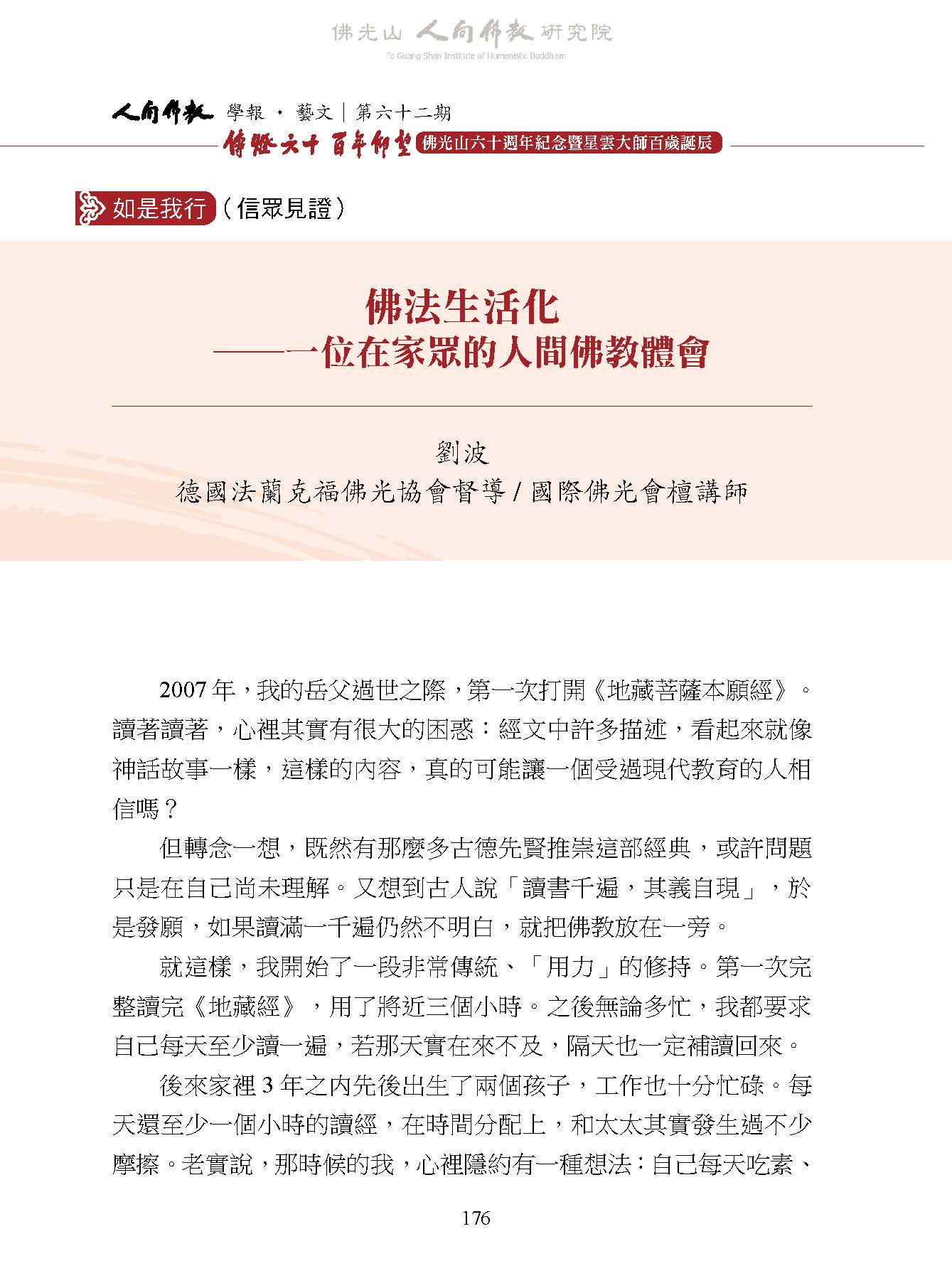劉波:〈佛法生活化―一位在家眾的人間佛教體會〉,收入妙凡、蔡孟樺主編:《人間佛教學報‧藝文》第62期,高雄:財團法人佛光山人間佛教研究院,2026年 03月,頁176-179。