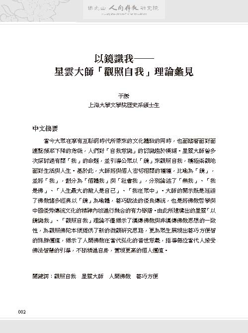 于騰:〈以鏡識我—星雲大師「觀照自我」理論蠡見〉,收入《2024人間佛教青年寫作論文集》,2025年 11月,頁2-33。
