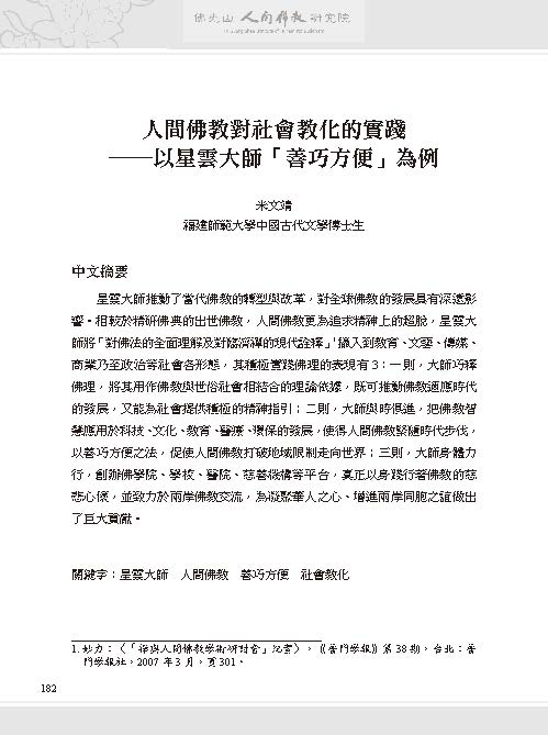 米文靖:〈人間佛教對社會教化的實踐—以星雲大師「善巧方便」為例〉,收入妙凡、李利安總主編:《2024人間佛教青年寫作論文集》,2025年 11月,頁182-207。