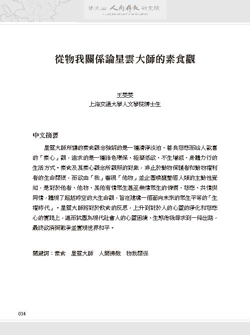 王雯雯:〈從物我關係論星雲大師的素食觀〉,收入妙凡、李利安總主編:《2024人間佛教青年寫作論文集》,2025年 11月,頁34-61。