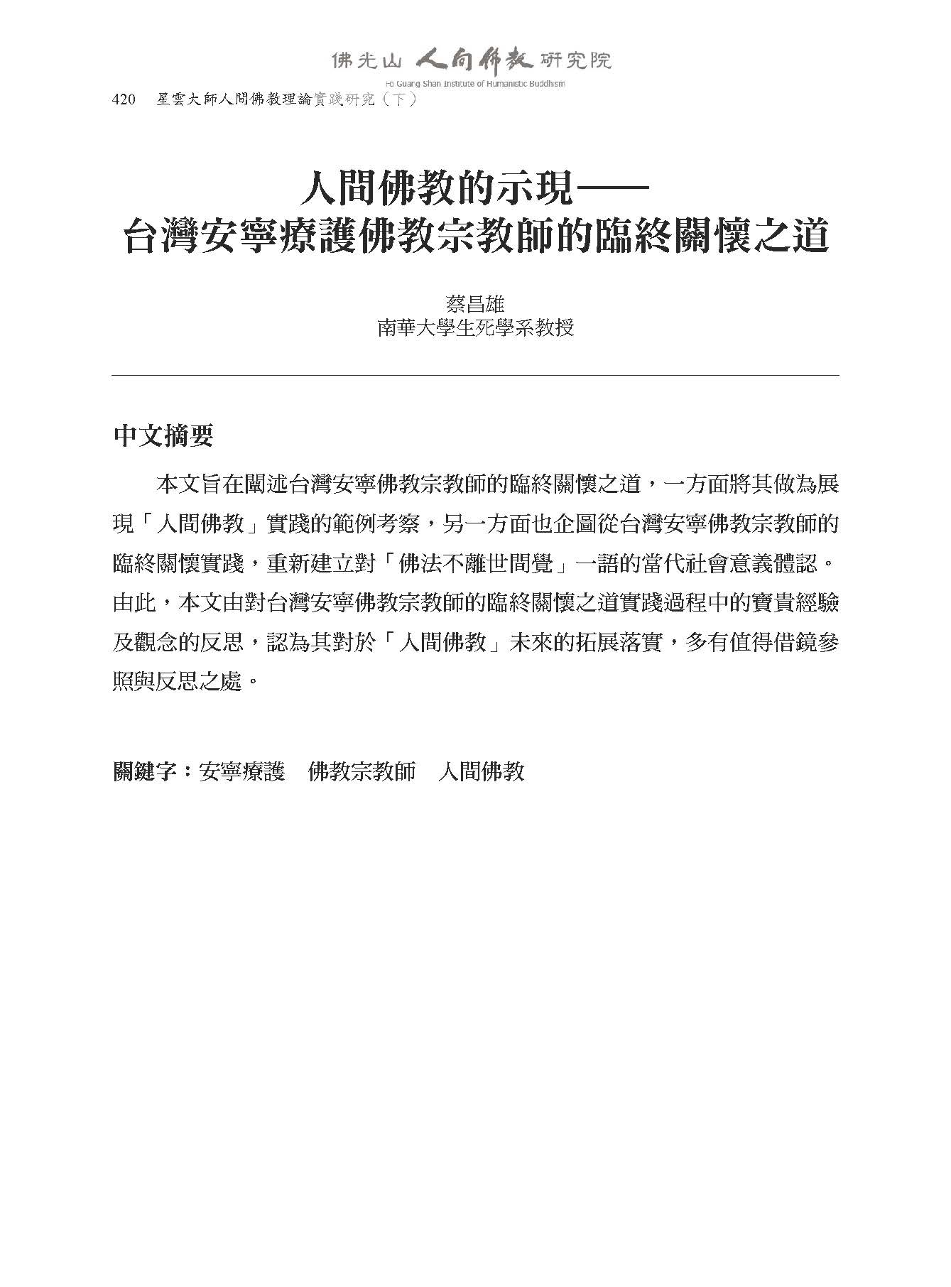 蔡昌雄:〈人間佛教的示現——台灣安寧療護佛教宗教師的臨終關懷之道〉,收入《2014星雲大師人間佛教理論實踐研究》,高雄:佛光文化,2014年 11月,頁420-441。