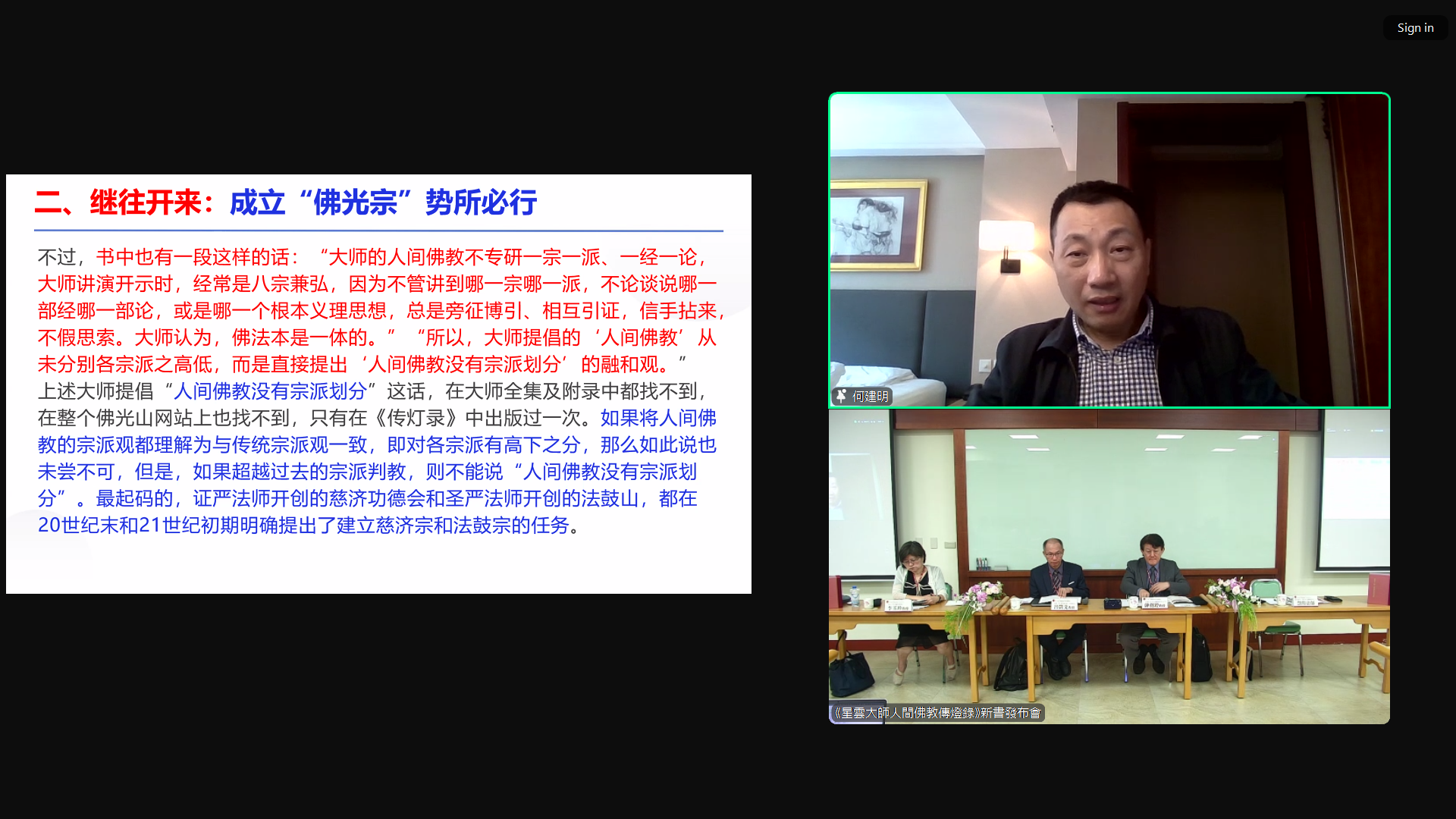 座談2图说:何建明教授以“承前启后”和“继往开来”论说这套书编撰和出版的重要历史意义,并开启有关“佛光宗成立”的探讨。