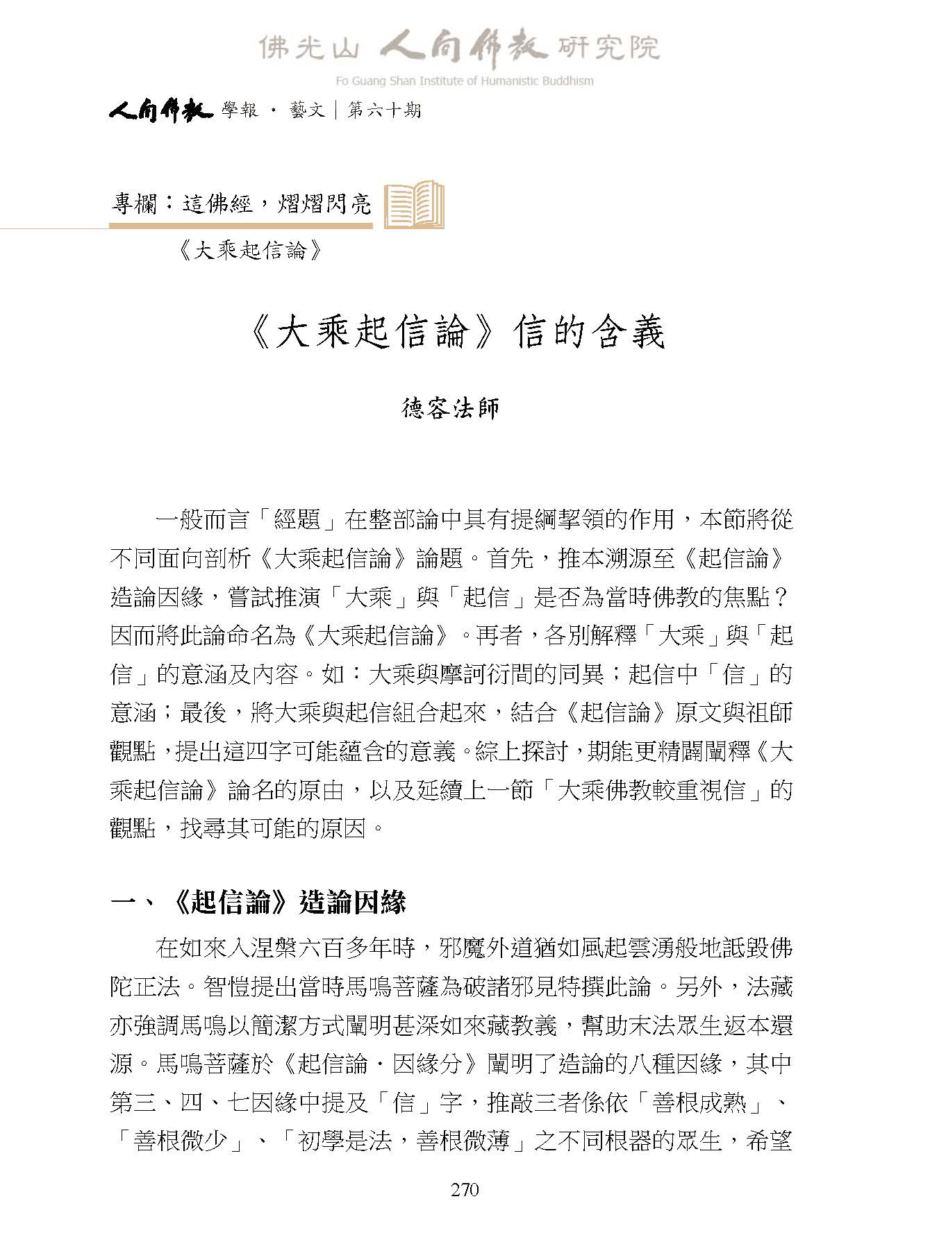 德容法師:〈《大乘起信論》信的含義〉,收入妙凡、蔡孟樺主編:《人間佛教學報‧藝文》第60期,高雄:財團法人佛光山人間佛教研究院,2025年 11月,頁270-279。