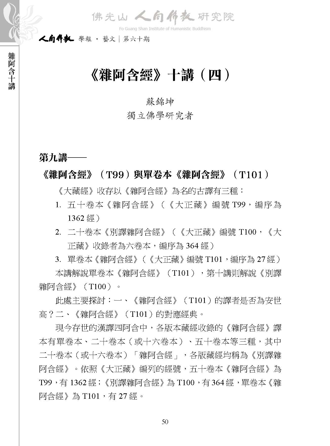 蘇錦坤:〈《雜阿含經》十講(四)〉,收入妙凡、蔡孟樺主編:《人間佛教學報‧藝文》第60期,高雄:財團法人佛光山人間佛教研究院,2025年 11月,頁50-73。
