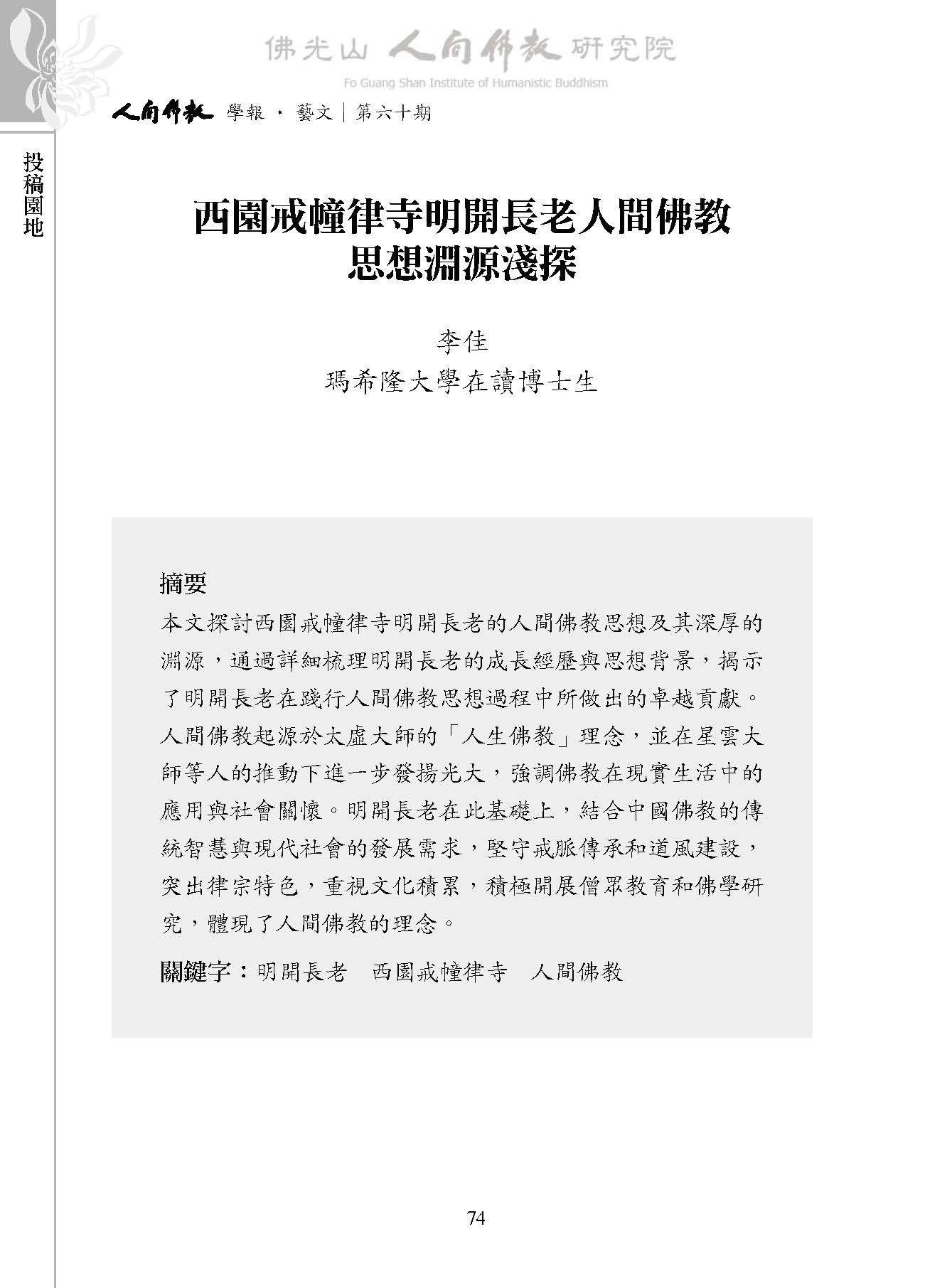 李佳:〈西園戒幢律寺明開長老人間佛教思想淵源淺探〉,收入妙凡、蔡孟樺主編:《人間佛教學報‧藝文》第60期,高雄:財團法人佛光山人間佛教研究院,2025年 11月,頁74-93。