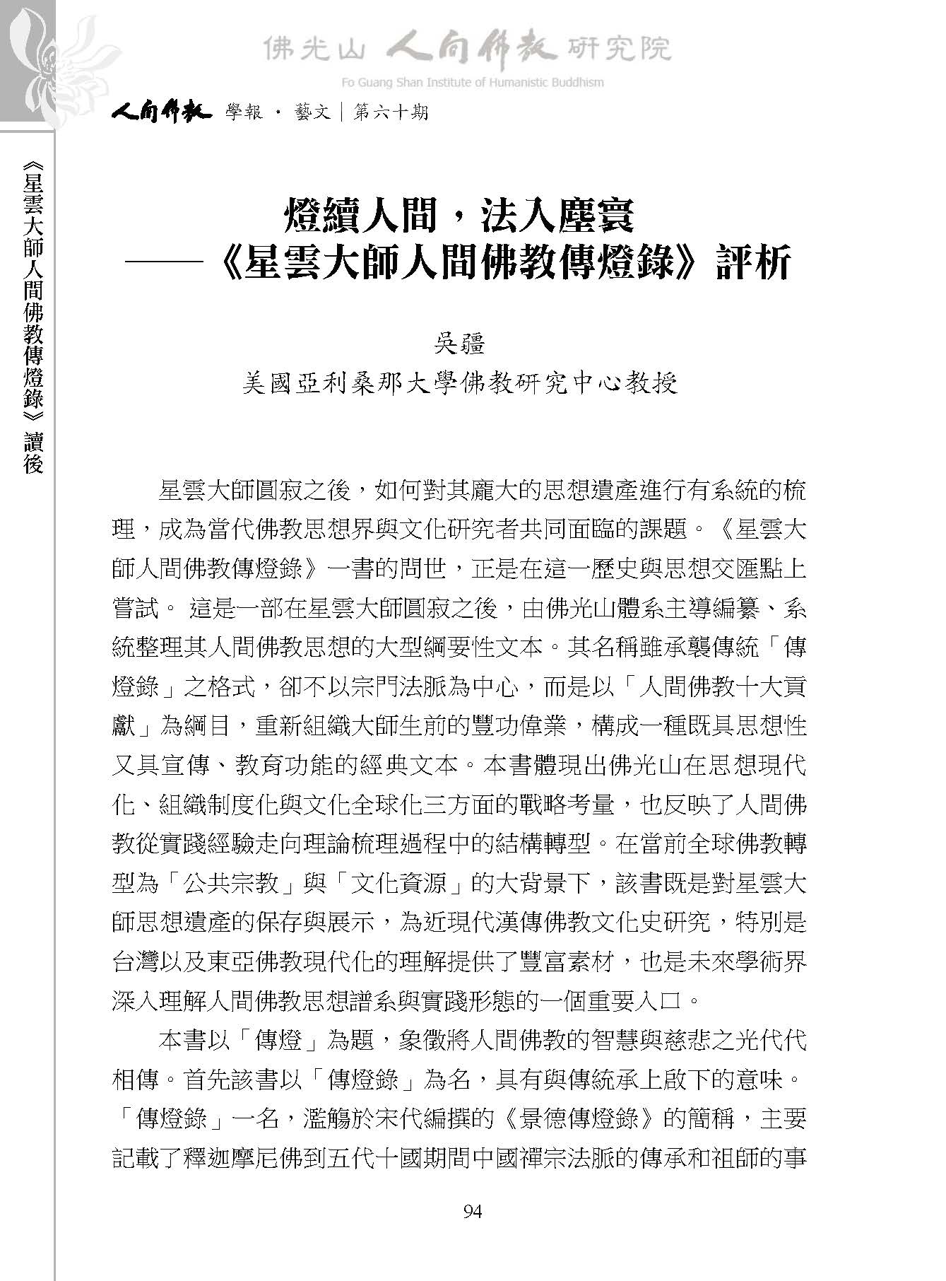 吳疆:〈燈續人間,法入塵寰 ―《星雲大師人間佛教傳燈錄》評析〉,收入妙凡、蔡孟樺主編:《人間佛教學報‧藝文》第60期,高雄:財團法人佛光山人間佛教研究院,2025年 11月,頁94-98。