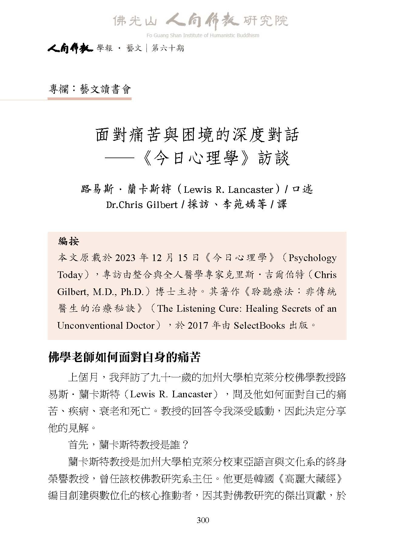 路易斯.蘭卡斯特:〈面對痛苦與困境的深度對話 —《今日心理學》訪談〉,收入妙凡、蔡孟樺主編:《人間佛教學報‧藝文》第60期,高雄:財團法人佛光山人間佛教研究院,2025年 11月,頁300-309。