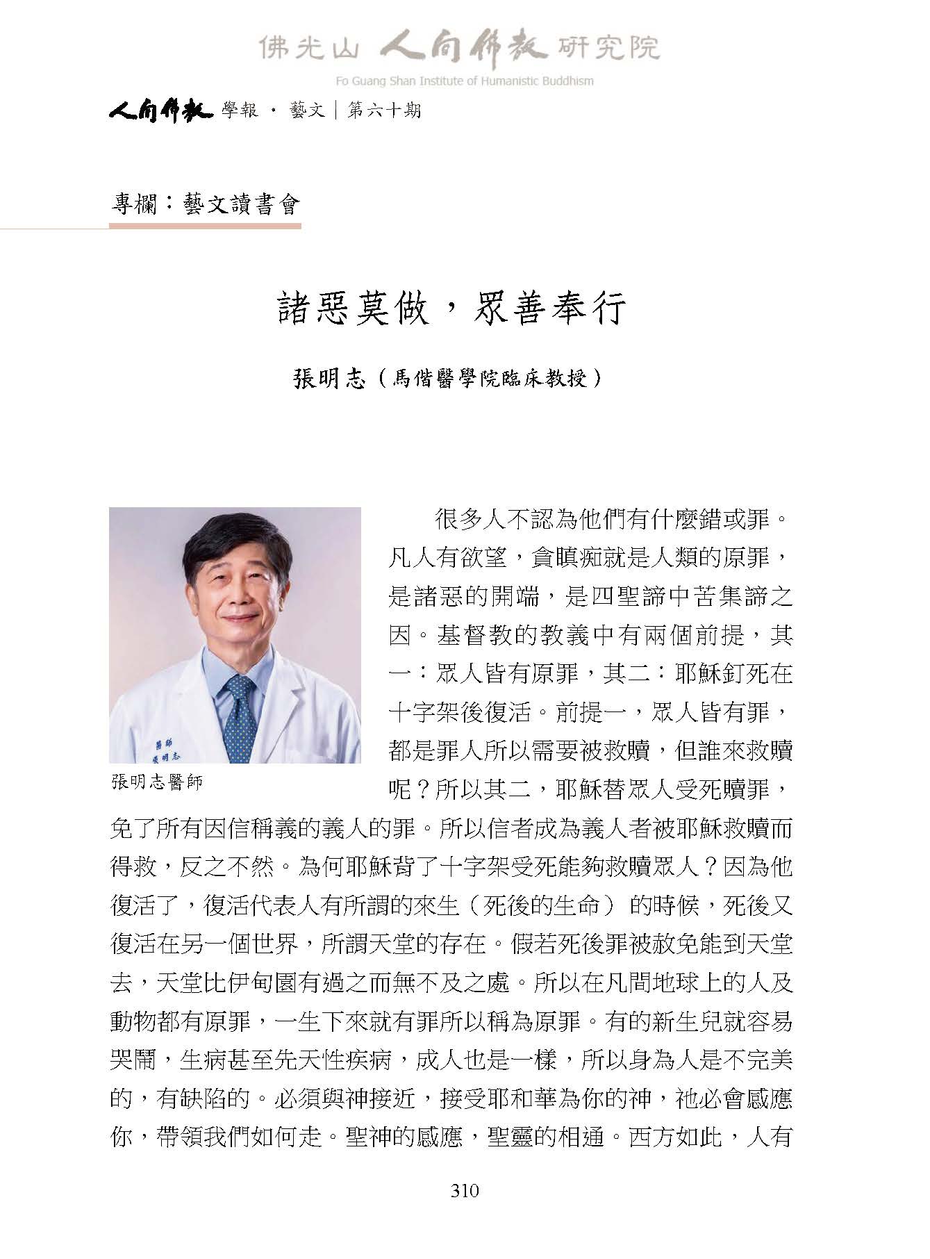 張明志:〈諸惡莫做,眾善奉行〉,收入妙凡、蔡孟樺主編:《人間佛教學報‧藝文》第60期,高雄:財團法人佛光山人間佛教研究院,2025年 11月,頁310-318。