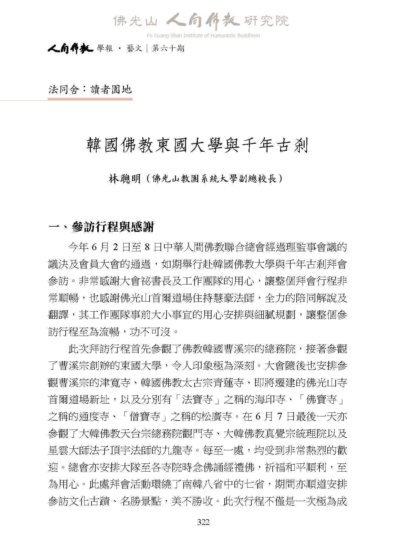 林聰明:〈韓國佛教東國大學與千年古剎〉,收入妙凡、蔡孟樺主編:《人間佛教學報‧藝文》第60期,高雄:財團法人佛光山人間佛教研究院,2025年 11月,頁322-327。