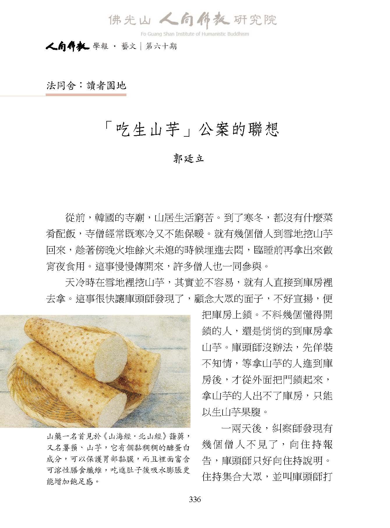 郭廷立:〈「吃生山芋」公案的聯想〉,收入妙凡、蔡孟樺主編:《人間佛教學報‧藝文》第60期,高雄:財團法人佛光山人間佛教研究院,2025年 11月,頁336-340。