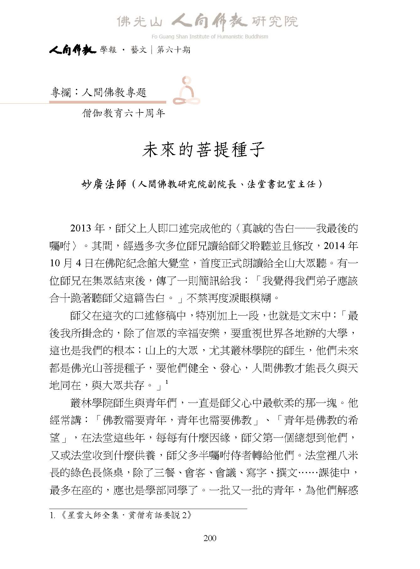 妙廣法師:〈未來的菩提種子〉,收入妙凡、蔡孟樺主編:《人間佛教學報‧藝文》第60期,高雄:財團法人佛光山人間佛教研究院,2025年 11月,頁200-203。