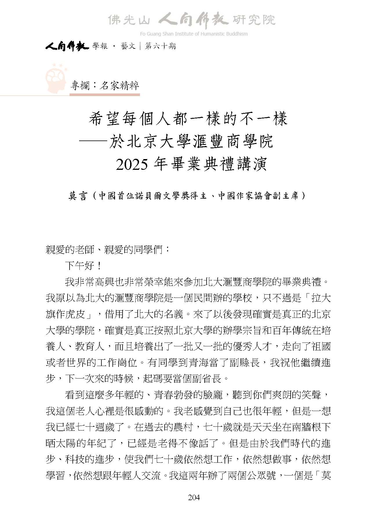 莫言:〈希望每個人都一樣的不一樣—於北京大學滙豐商學院2025 年畢業典禮講演〉,收入妙凡、蔡孟樺主編:《人間佛教學報‧藝文》第60期,高雄:財團法人佛光山人間佛教研究院,2025年 11月,頁204-213。