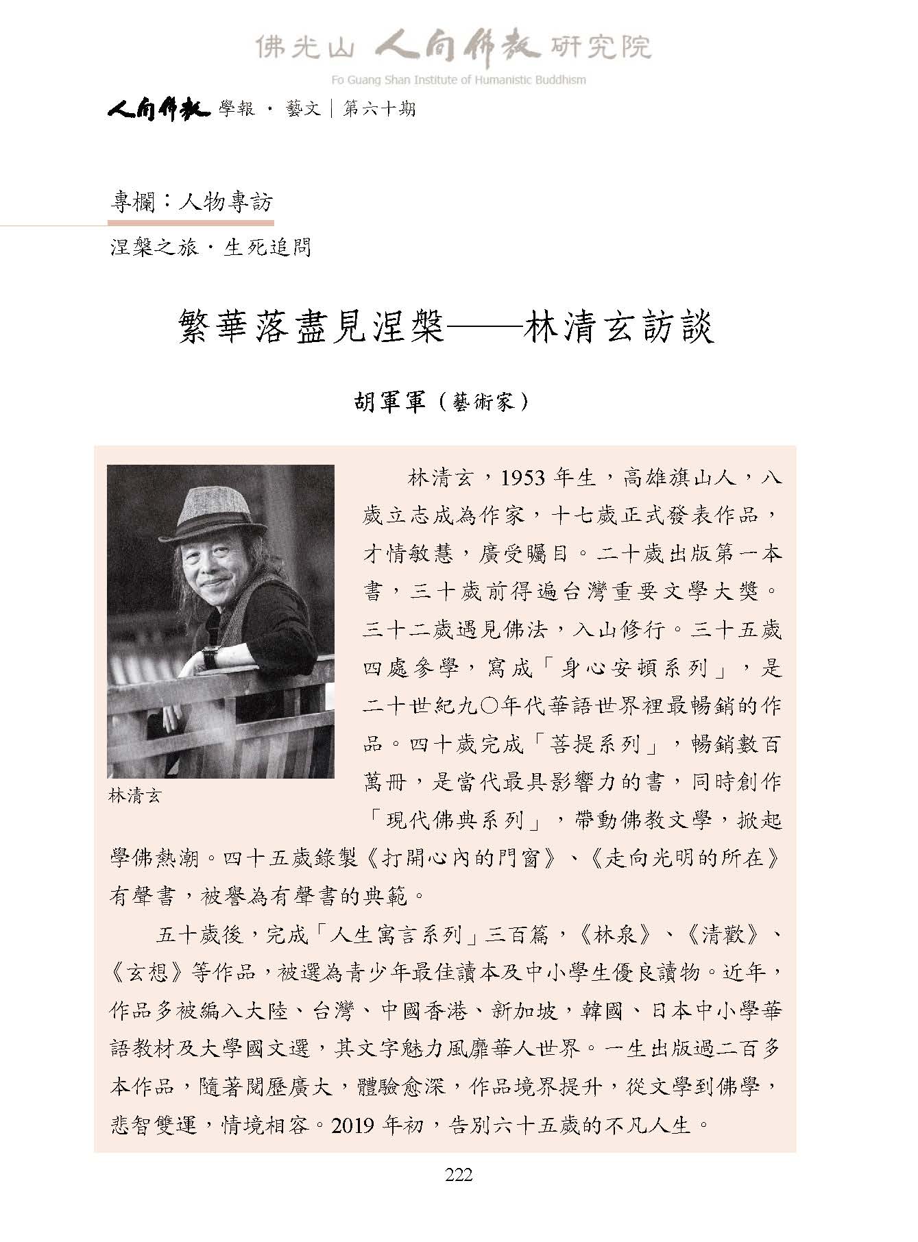 胡軍軍:〈繁華落盡見涅槃―林清玄訪談〉,收入妙凡、蔡孟樺主編:《人間佛教學報‧藝文》第60期,高雄:財團法人佛光山人間佛教研究院,2025年 11月,頁222-247。