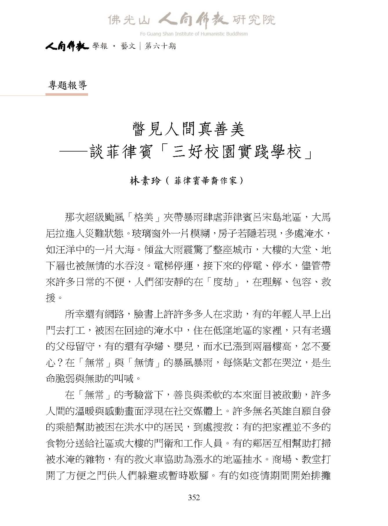 林素玲:〈瞥見人間真善美—談菲律賓「三好校園實踐學校」〉,收入妙凡、蔡孟樺主編:《人間佛教學報‧藝文》第60期,高雄:財團法人佛光山人間佛教研究院,2025年 11月,頁352-361。