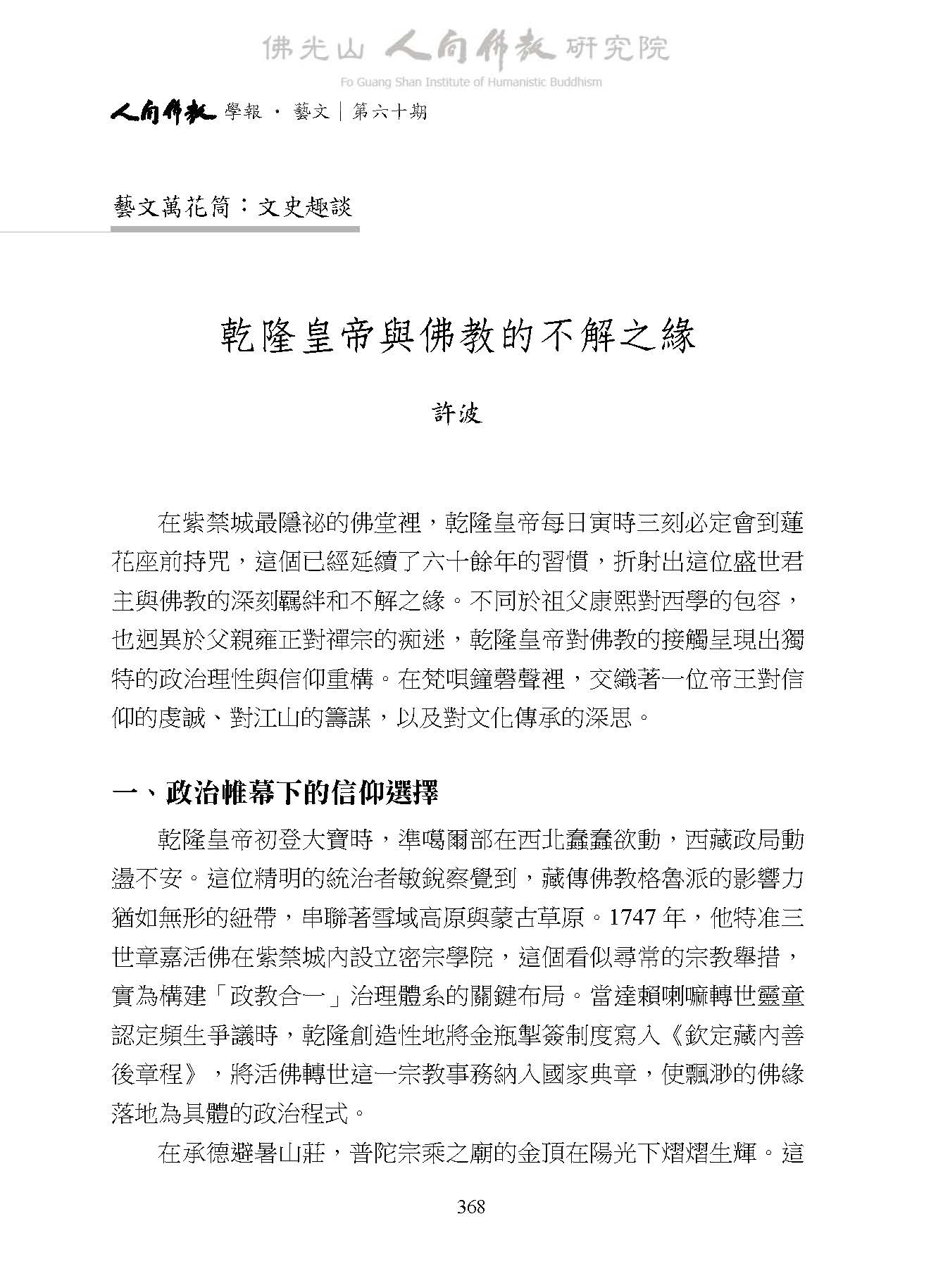許波:〈乾隆皇帝與佛教的不解之緣〉,收入妙凡、蔡孟樺主編:《人間佛教學報‧藝文》第60期,高雄:財團法人佛光山人間佛教研究院,2025年 11月,頁368-371。